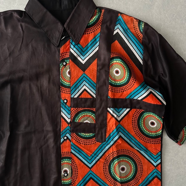 アジアンネイティブ柄アシンメトリー半袖シャツ ブラウン L 古着 メンズ