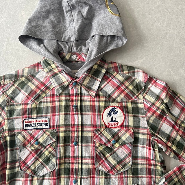 取り外しフード付きチェック柄ワッペンシャツ チェック柄 M 古着 メンズ