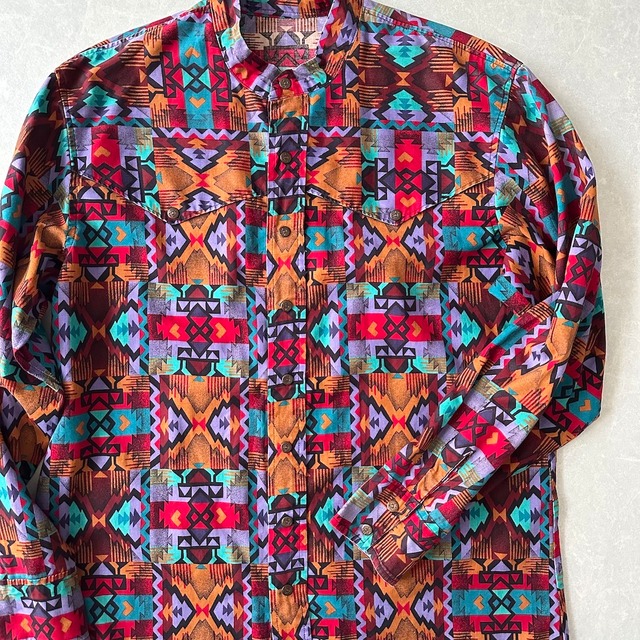 幾何学柄ネイティブ柄スタンドカラーシャツ 総柄 L 古着 メンズ