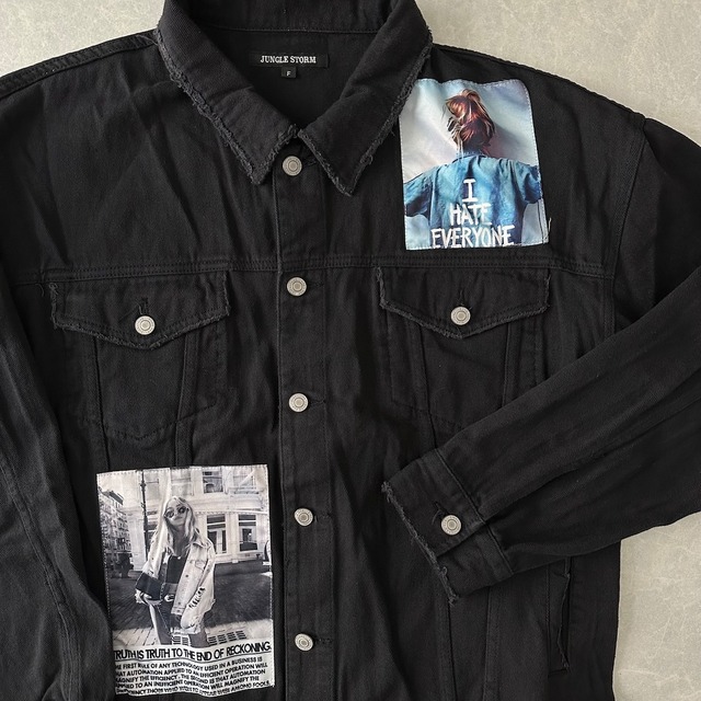 フォトプリントブラックデニムジャケット ブラック F 古着 メンズ