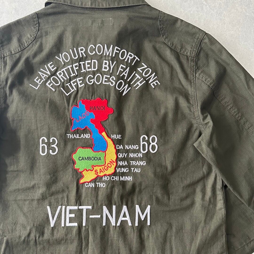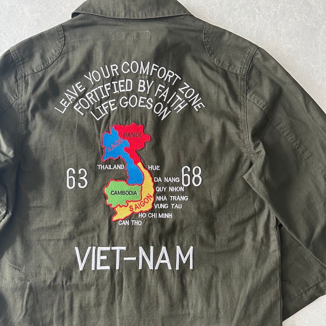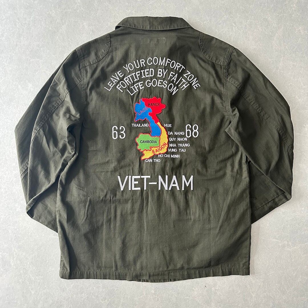 ミリタリー ベトナム シャツ ジャケット カーキ S 古着 メンズ 古着男子 アメカジ古着 ベトジャン 刺繍 緑 グリーン