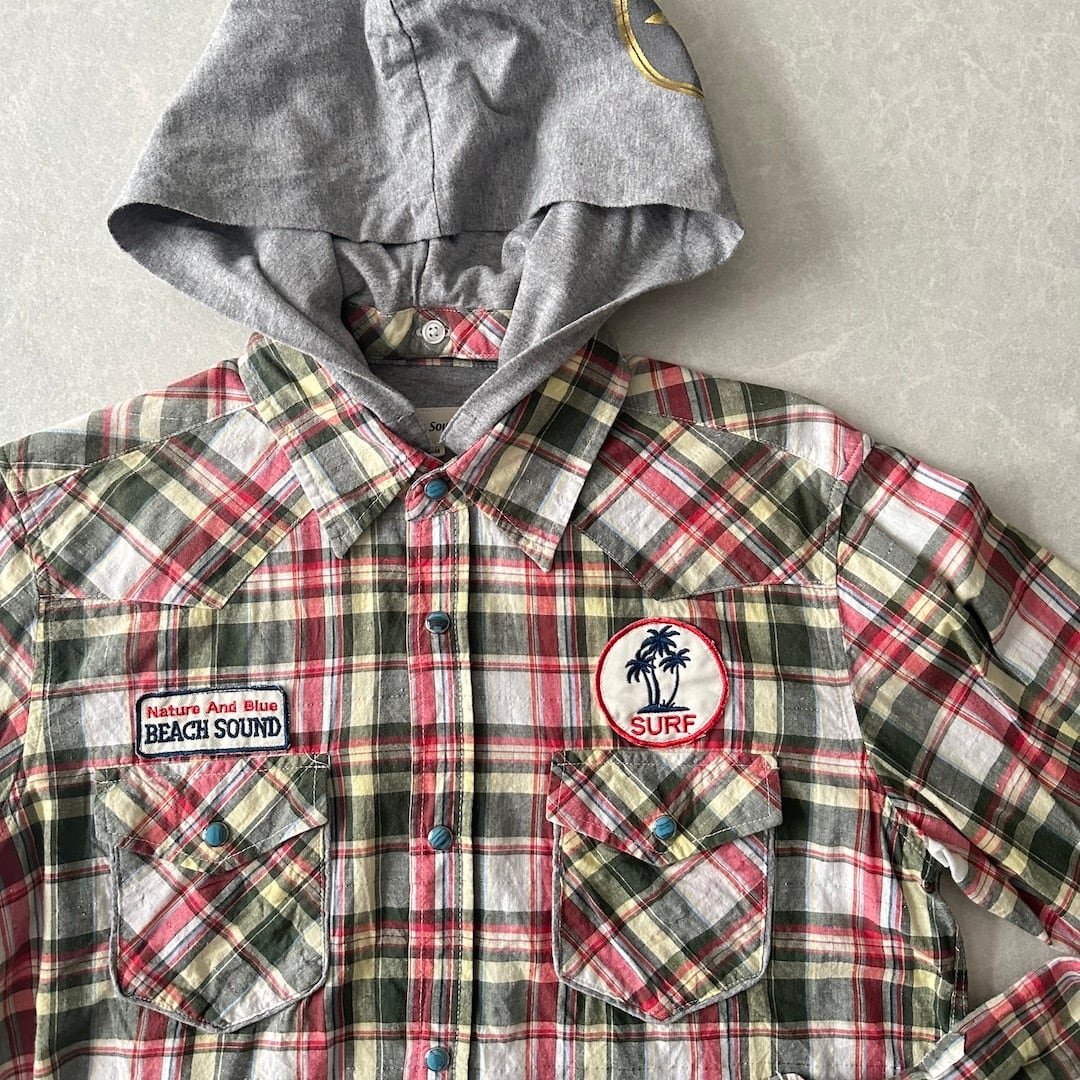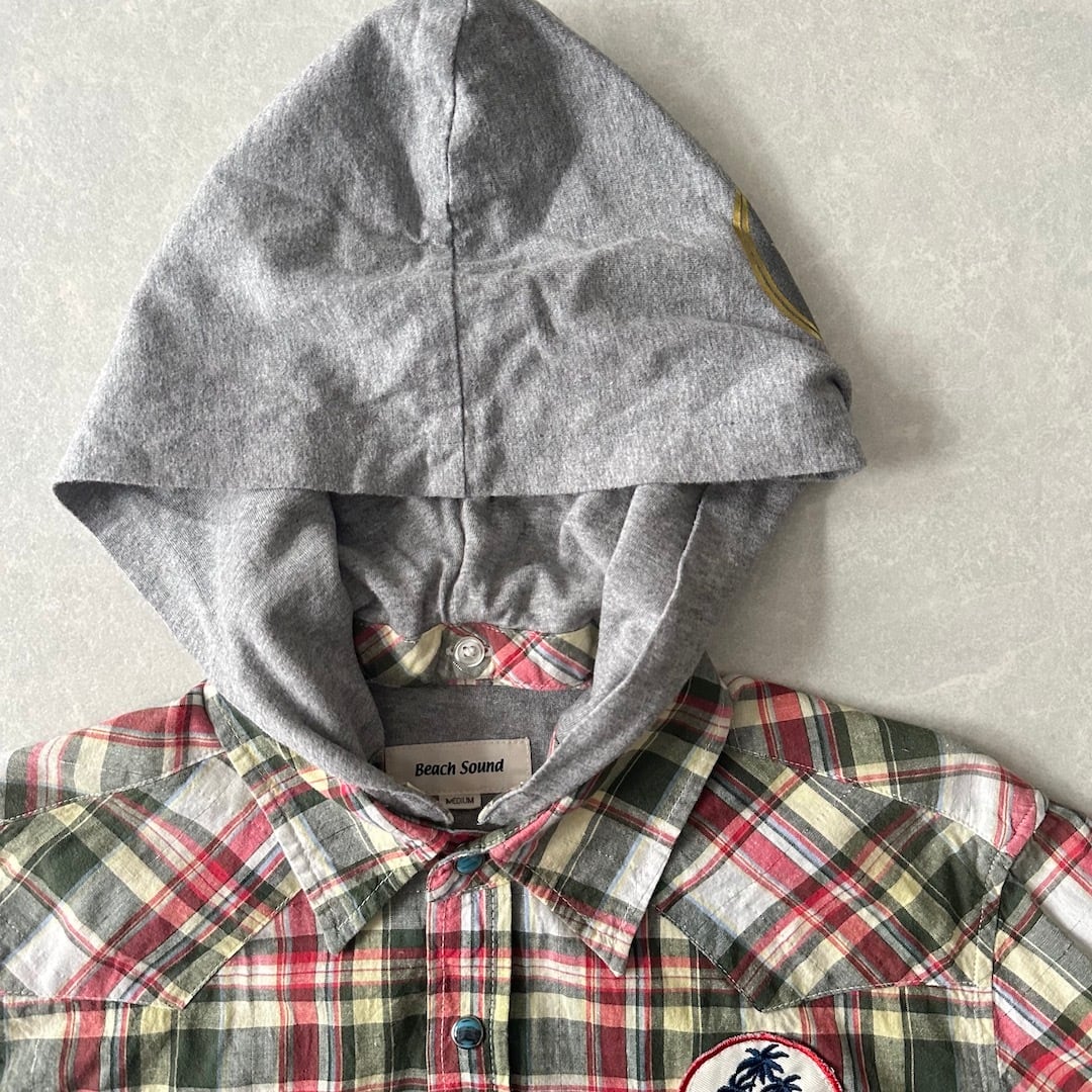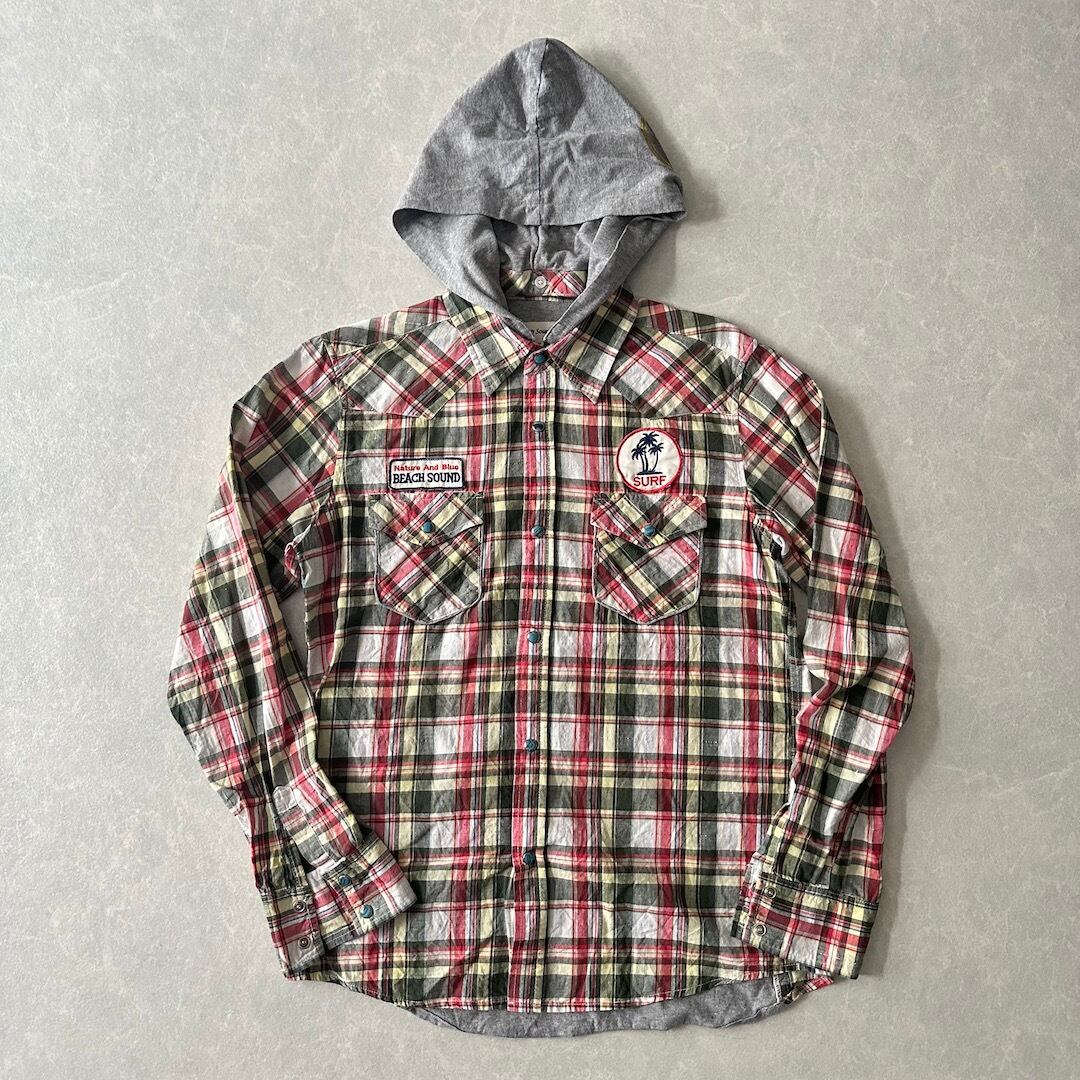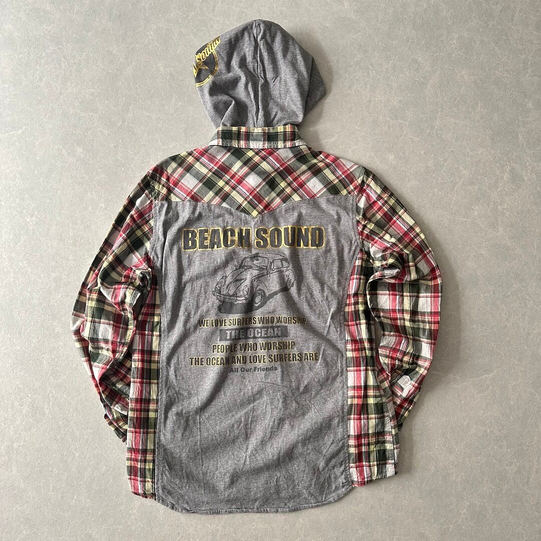 取り外し フード チェック柄 ワッペン シャツ チェック柄 M 古着 メンズ 古着男子 サーフ古着 サーフシャツ 海 ビーチ サーファー スウェット バックプリント