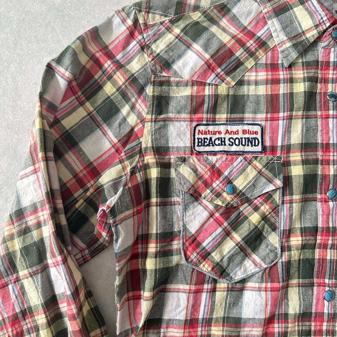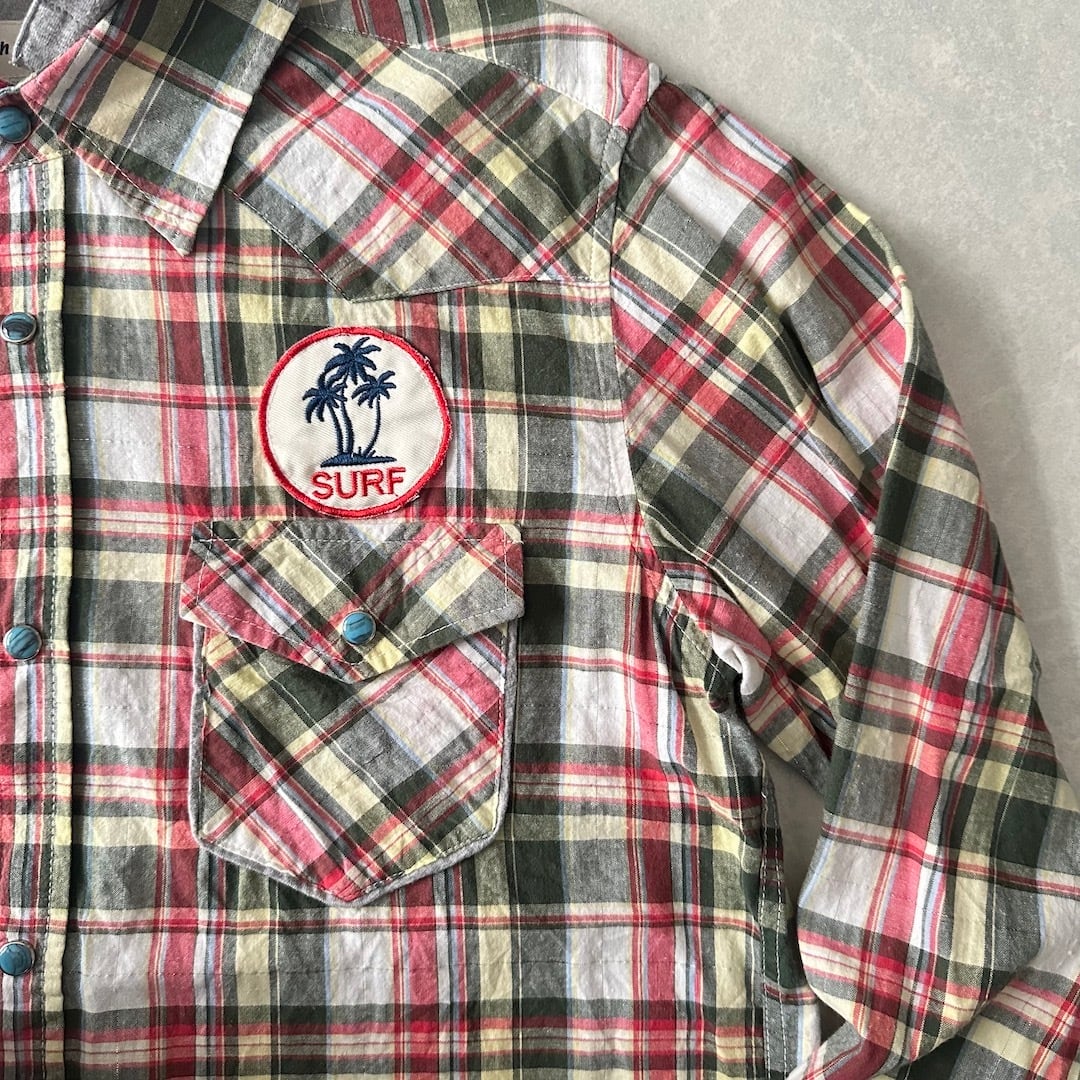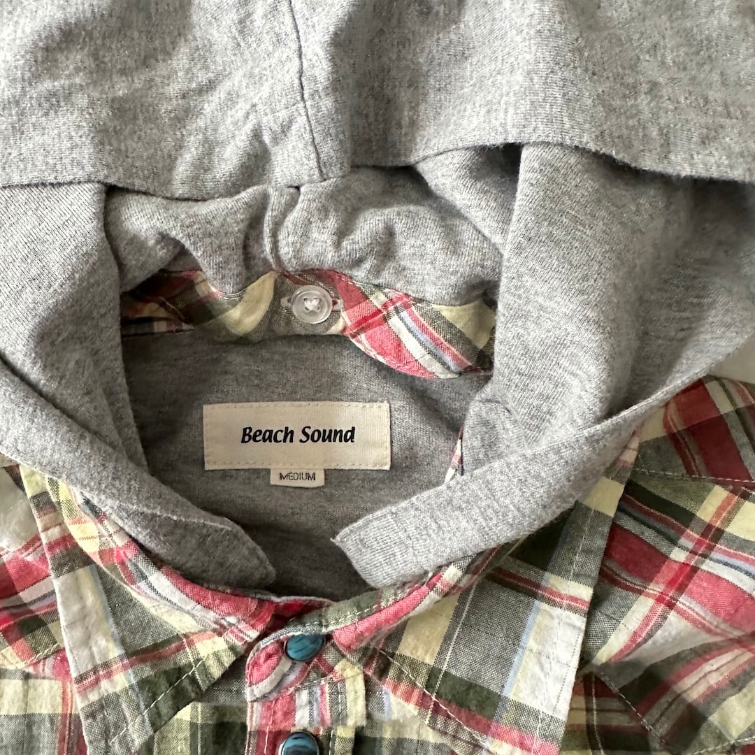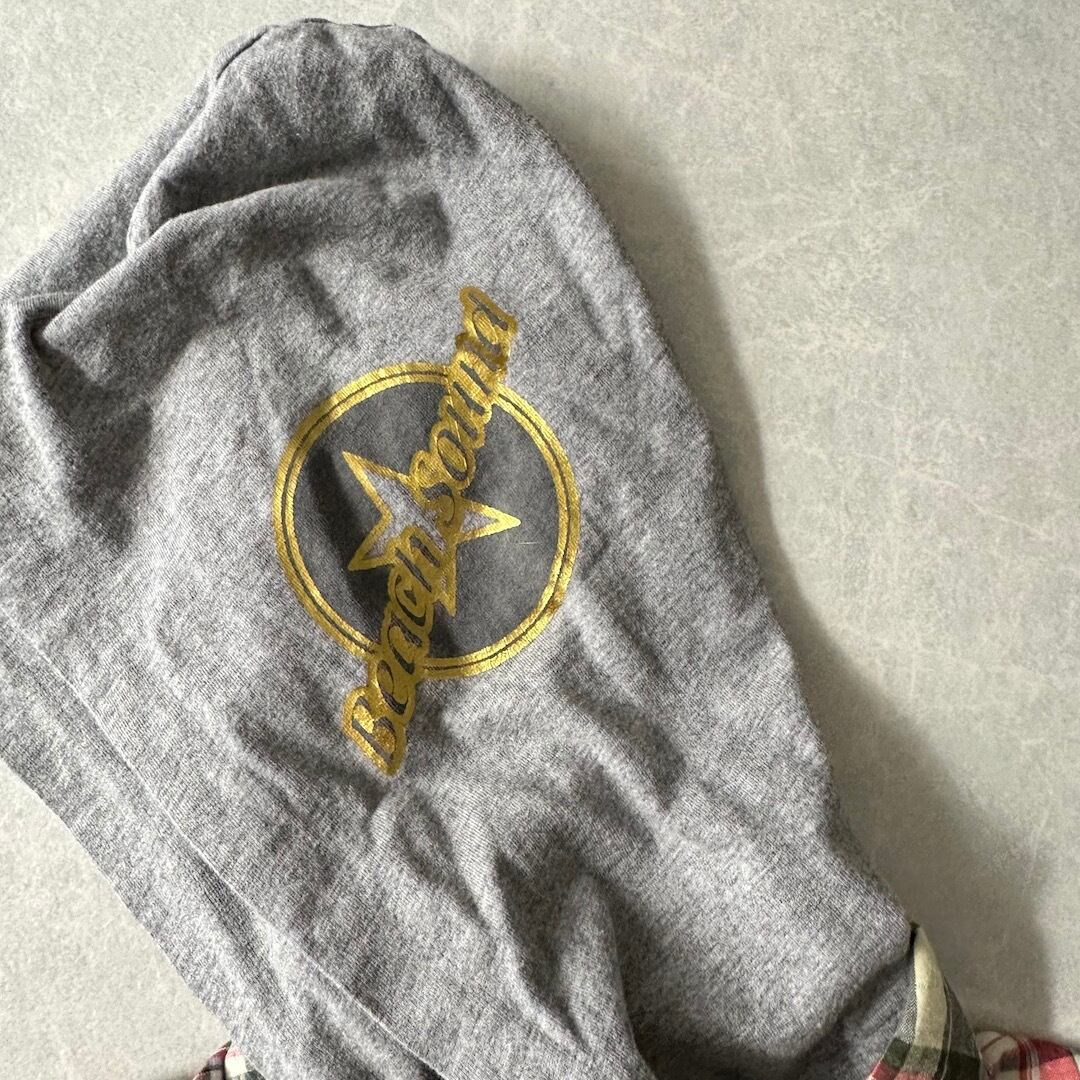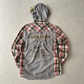 取り外し フード チェック柄 ワッペン シャツ チェック柄 M 古着 メンズ 古着男子 サーフ古着 サーフシャツ 海 ビーチ サーファー スウェット バックプリント