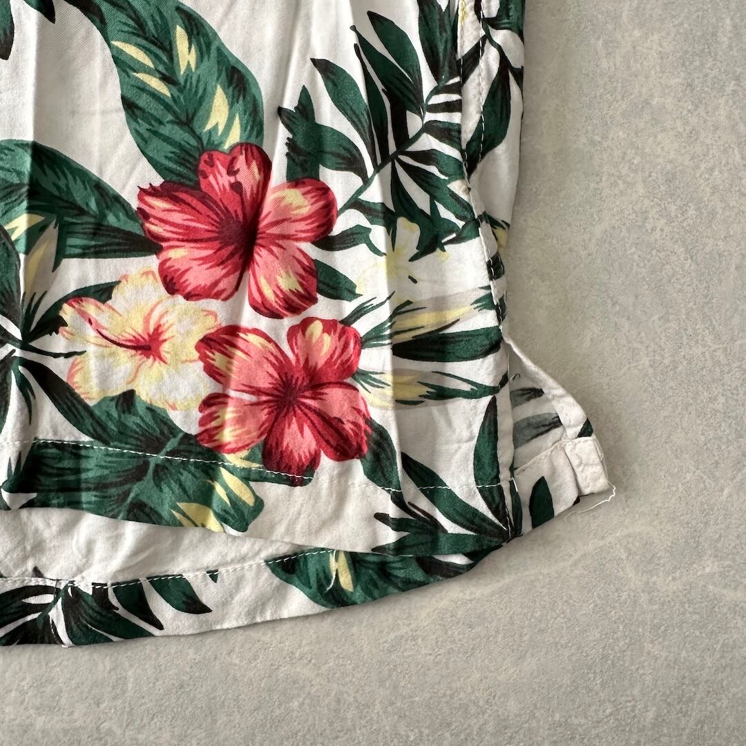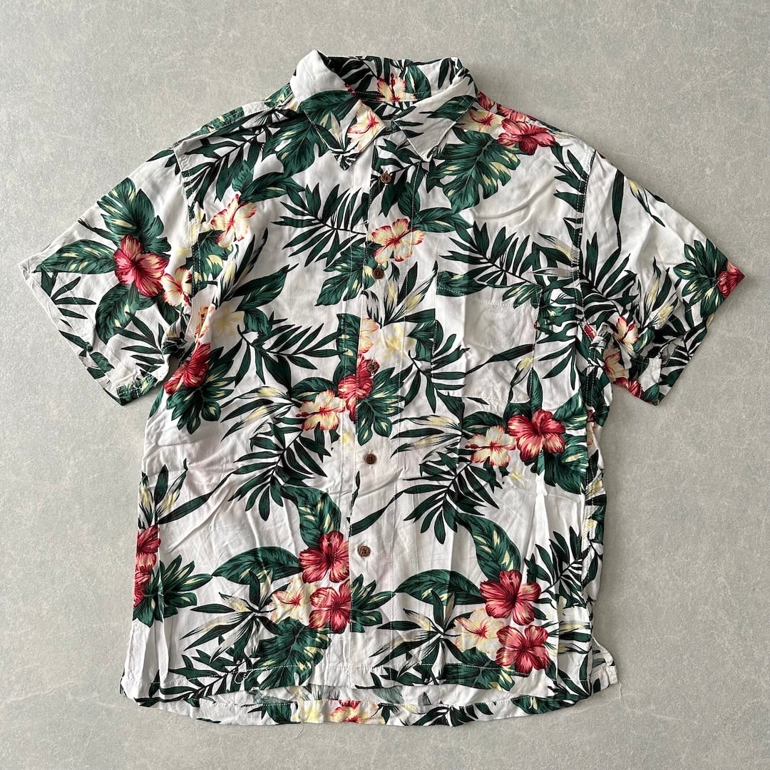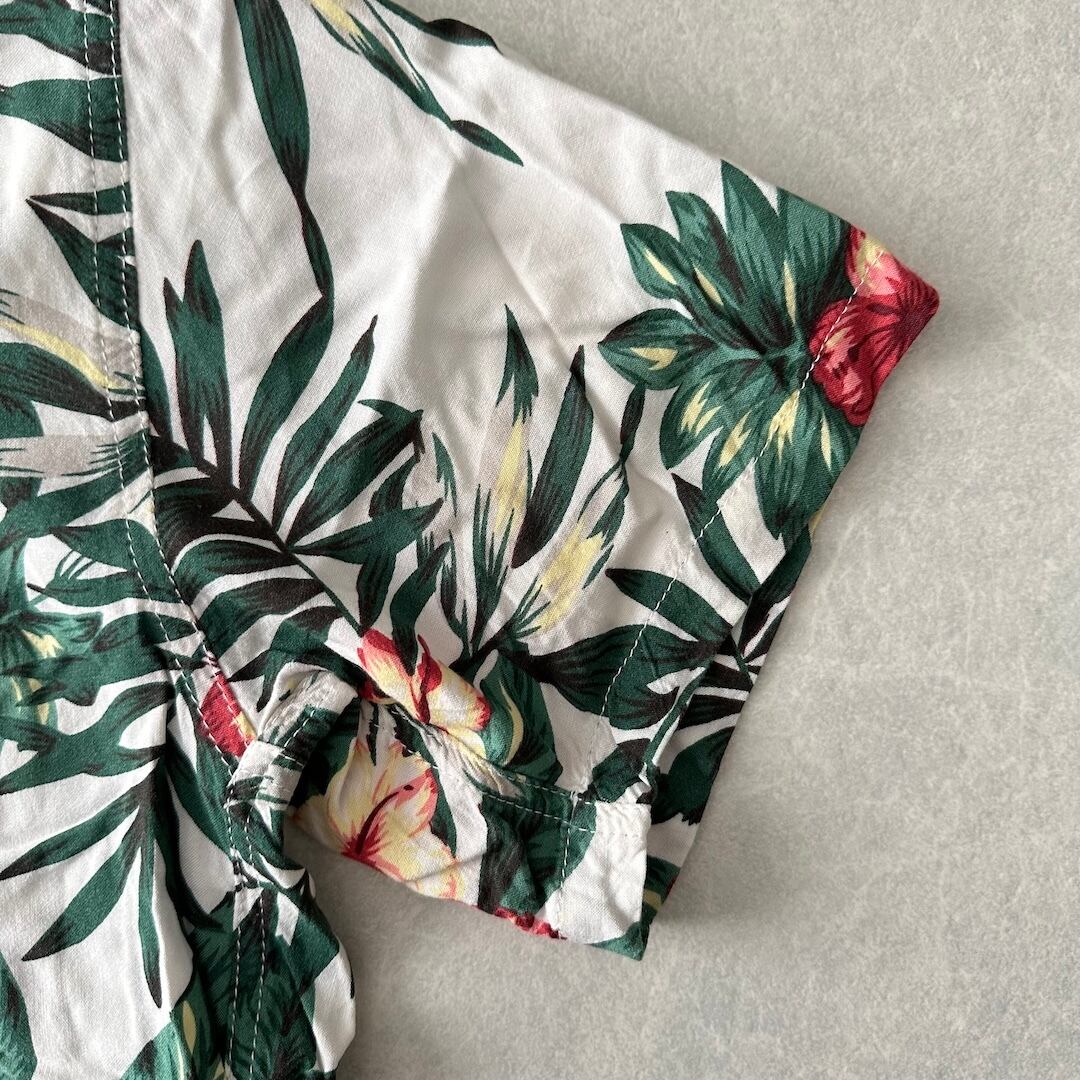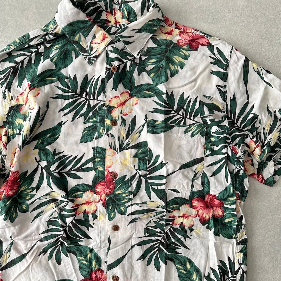 ボタニカル柄 リーフ プリント 半袖 シャツ 総柄 L 古着 メンズ 古着男子 サーフ古着 海 ビーチ 南国 トロピカル リゾート ホワイト 白 グリーン 緑 花柄