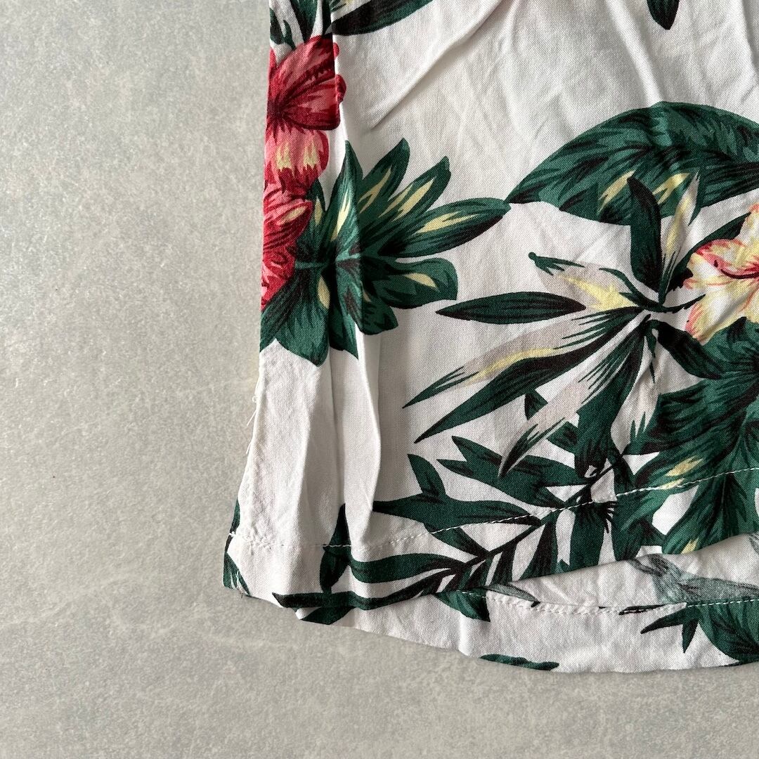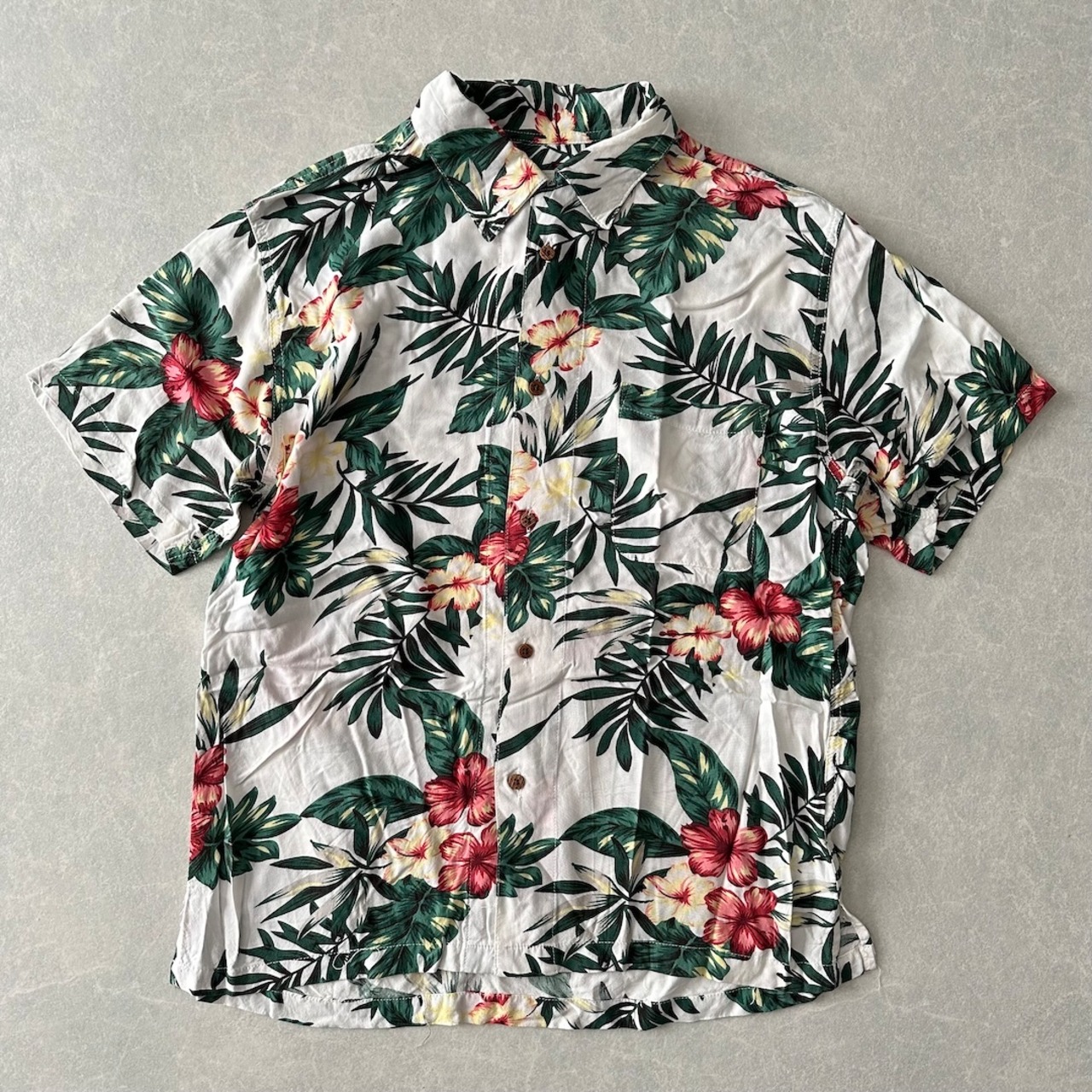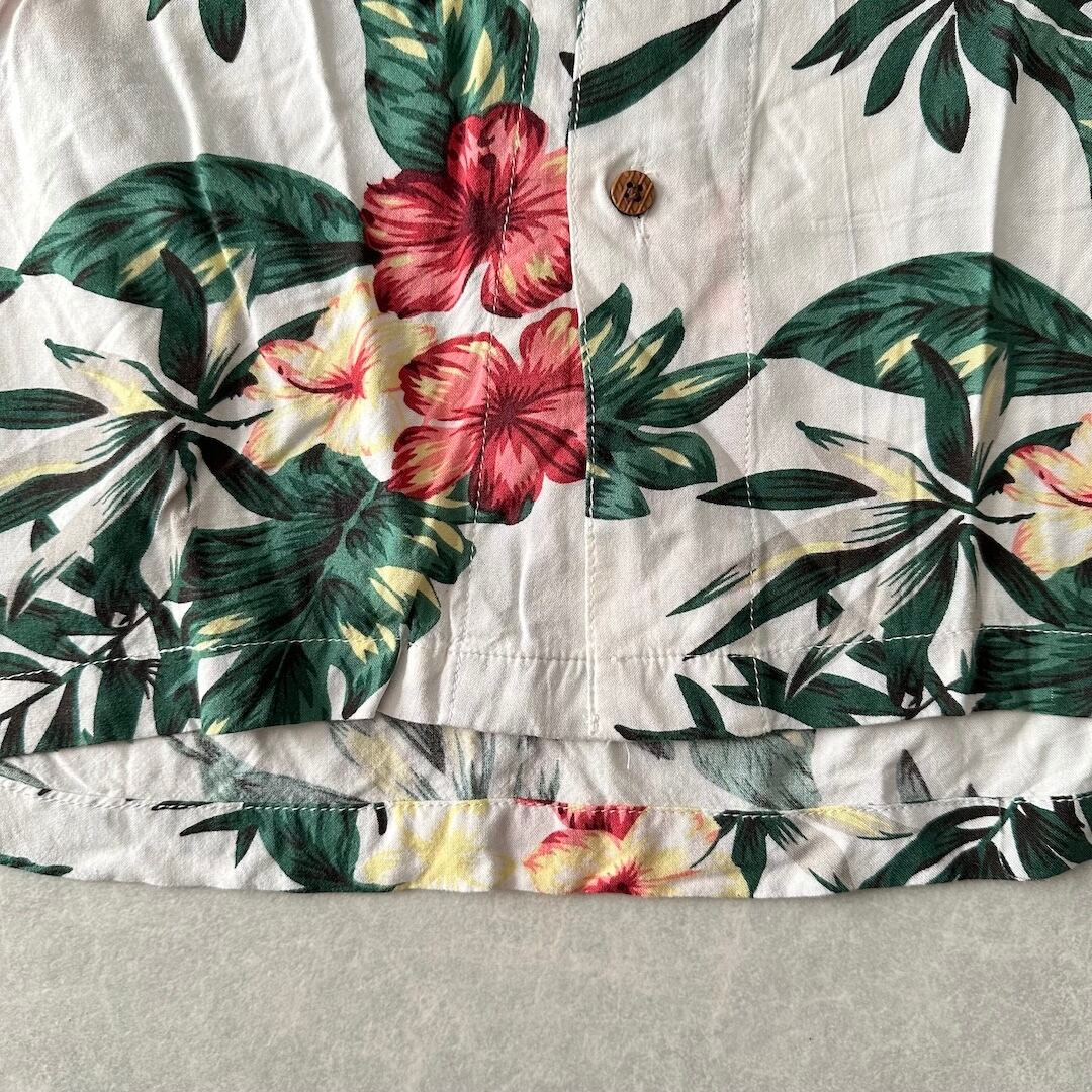 ボタニカル柄 リーフ プリント 半袖 シャツ 総柄 L 古着 メンズ 古着男子 サーフ古着 海 ビーチ 南国 トロピカル リゾート ホワイト 白 グリーン 緑 花柄