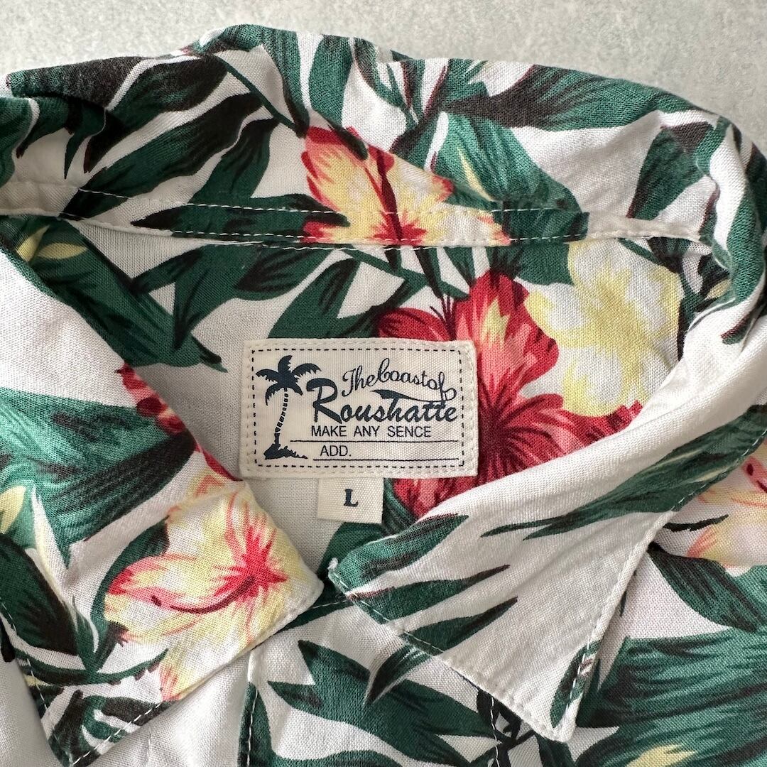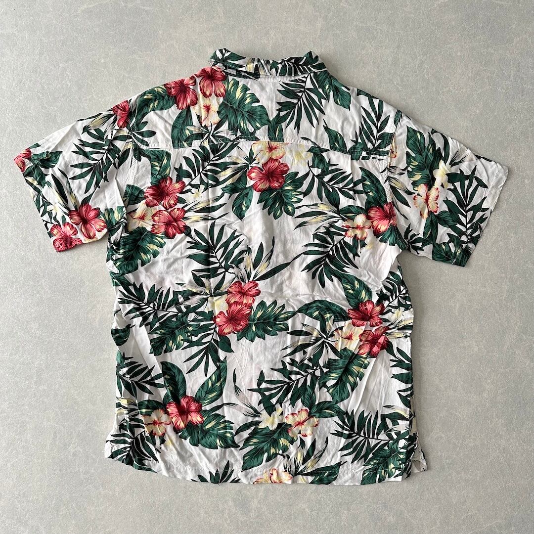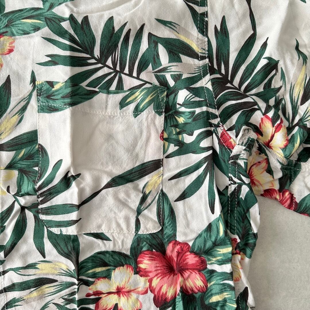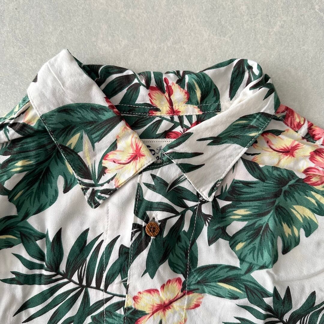 ボタニカル柄 リーフ プリント 半袖 シャツ 総柄 L 古着 メンズ 古着男子 サーフ古着 海 ビーチ 南国 トロピカル リゾート ホワイト 白 グリーン 緑 花柄