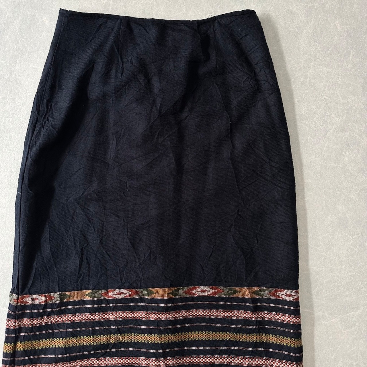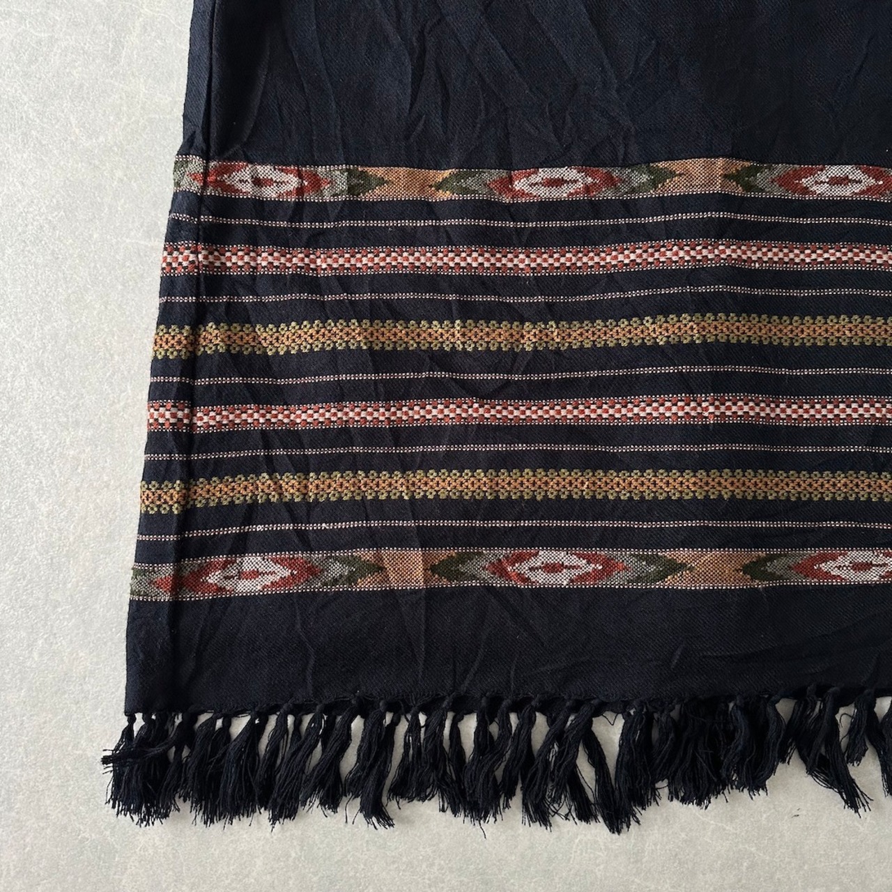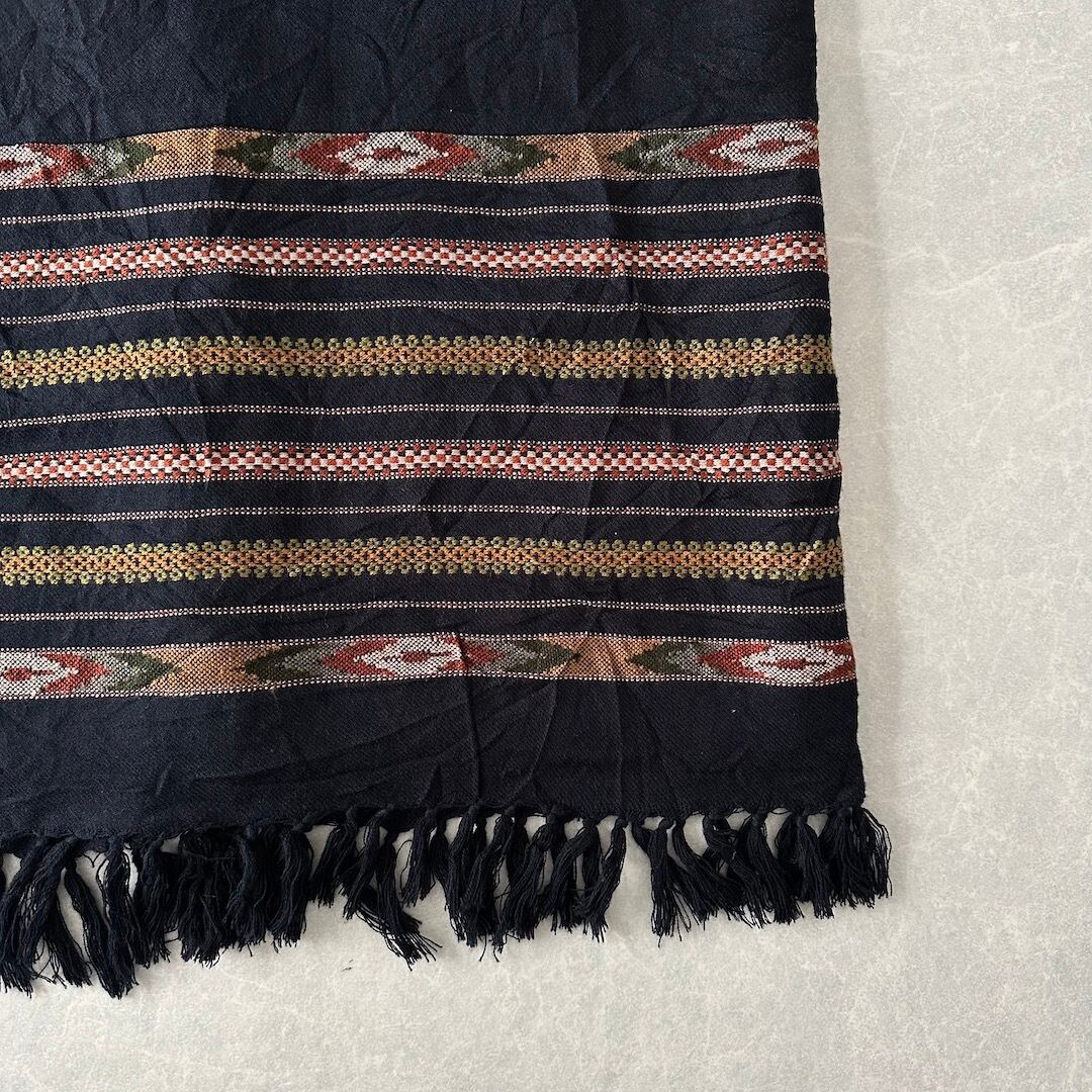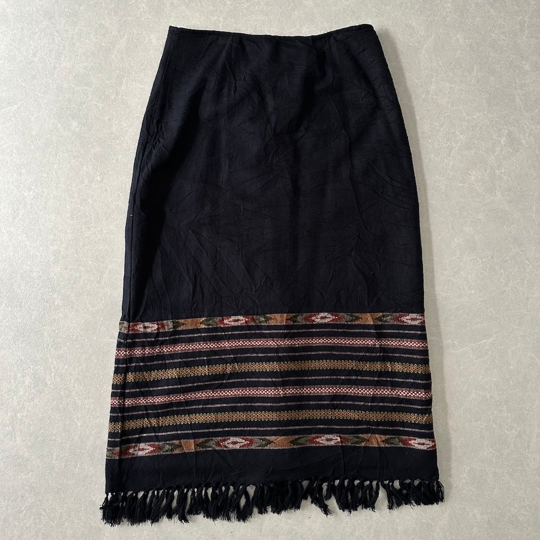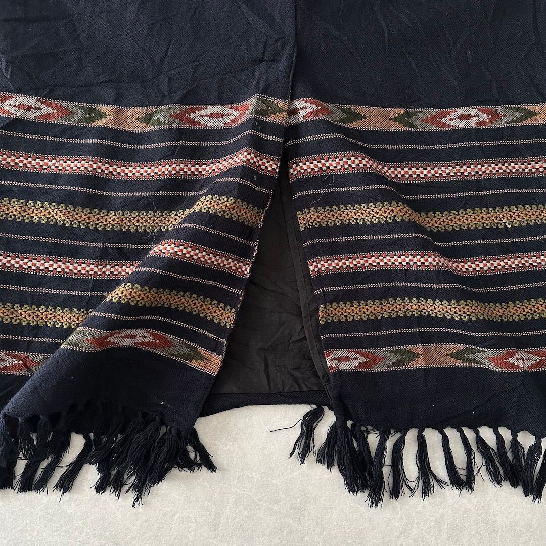 【WHITE STAG】幾何学 ネイティブ ボーダー柄 膝下丈 フリンジ スカート ボーダー柄 38 古着 レディース 古着女子 ブランド古着 アウトドア古着 ブラック 黒 アクリル