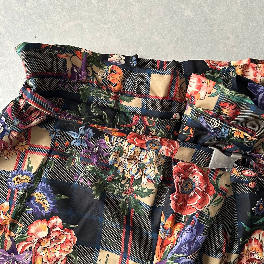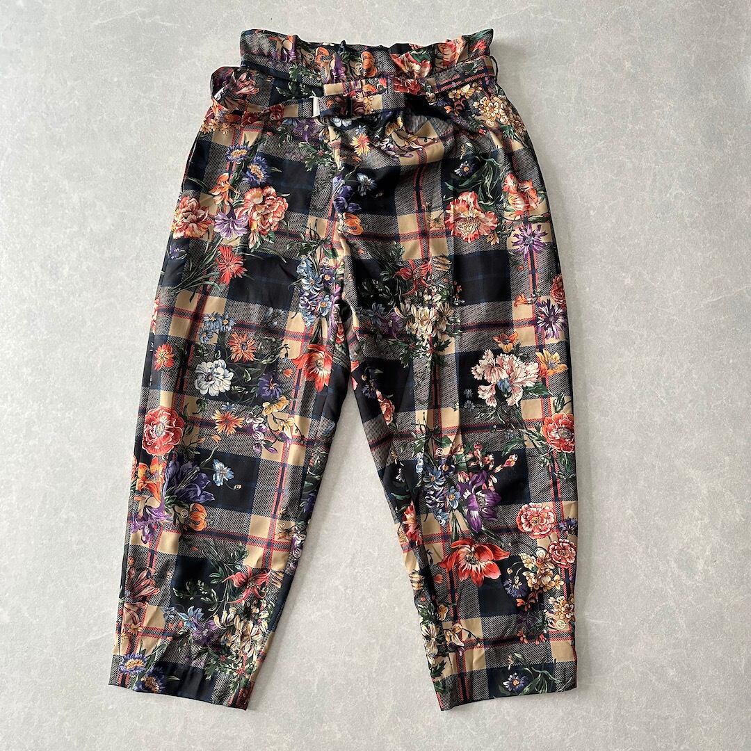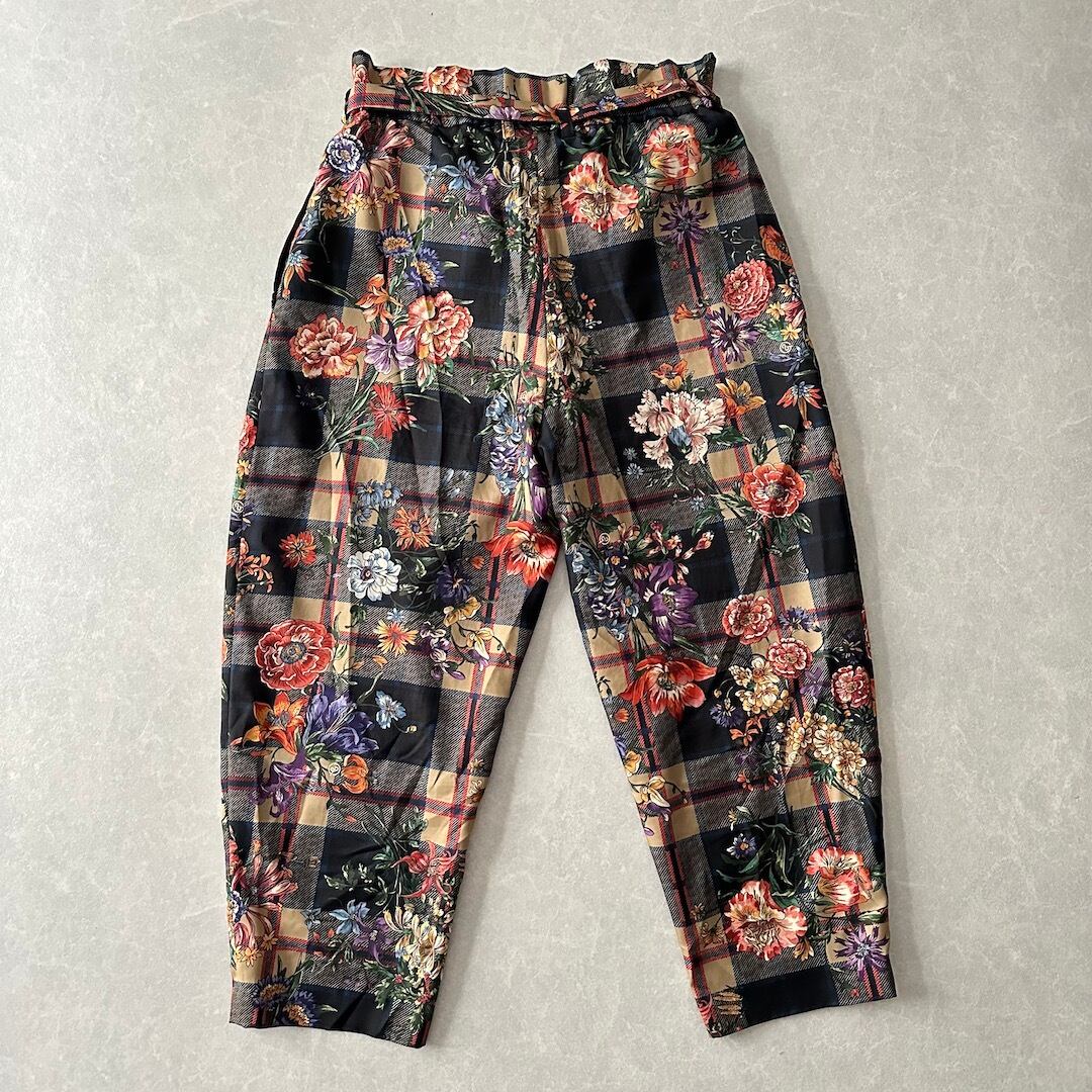 チェック 花柄 プリント ワイドパンツ 総柄 M 古着 メンズ 古着男子 フラワープリント ベルト付き アート柄 モード