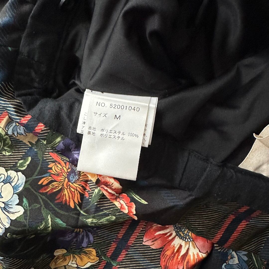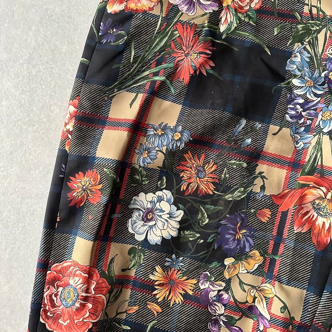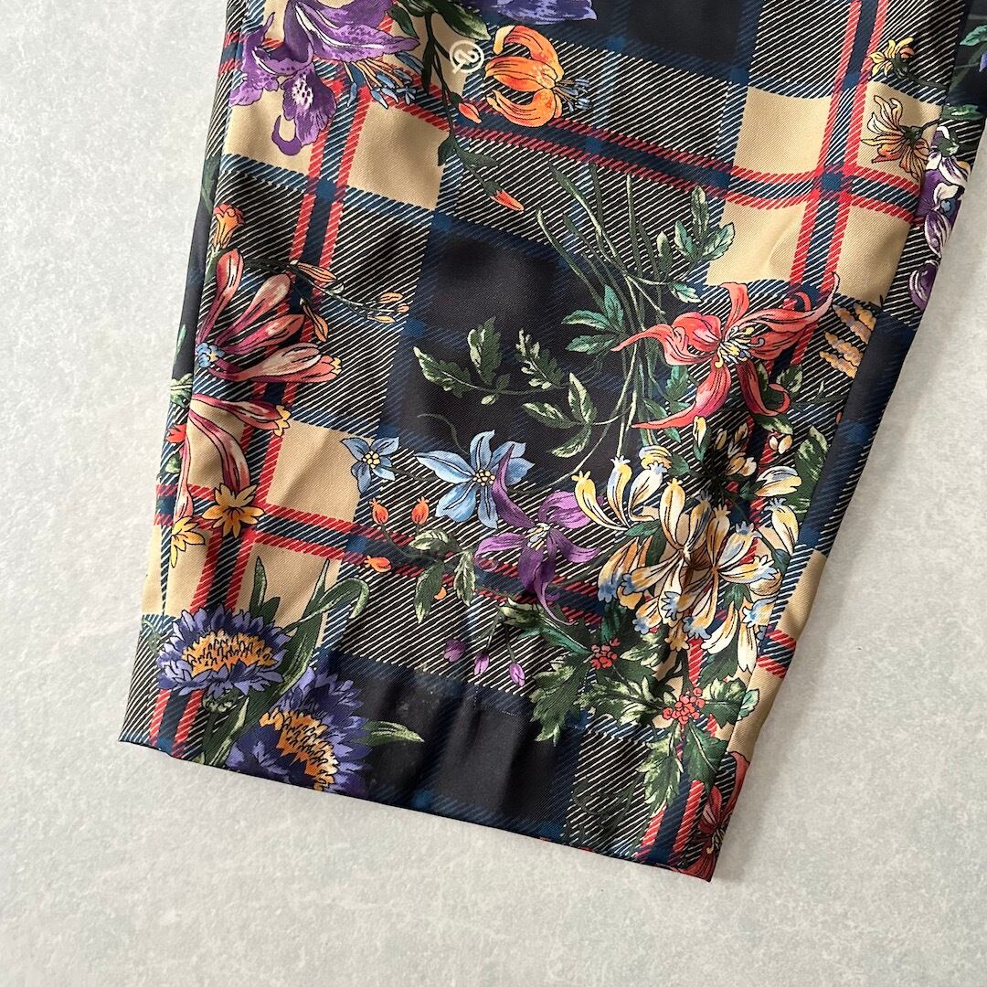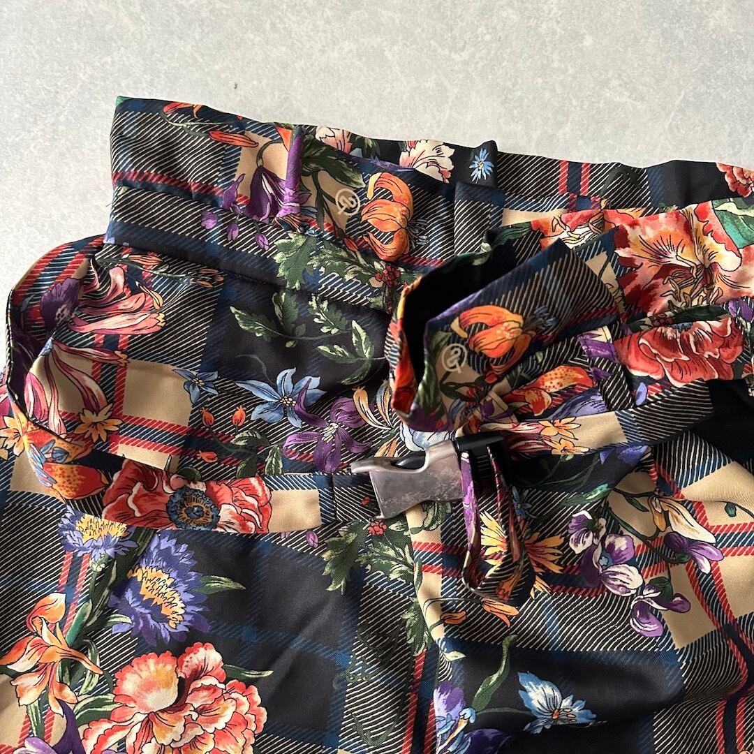 チェック 花柄 プリント ワイドパンツ 総柄 M 古着 メンズ 古着男子 フラワープリント ベルト付き アート柄 モード