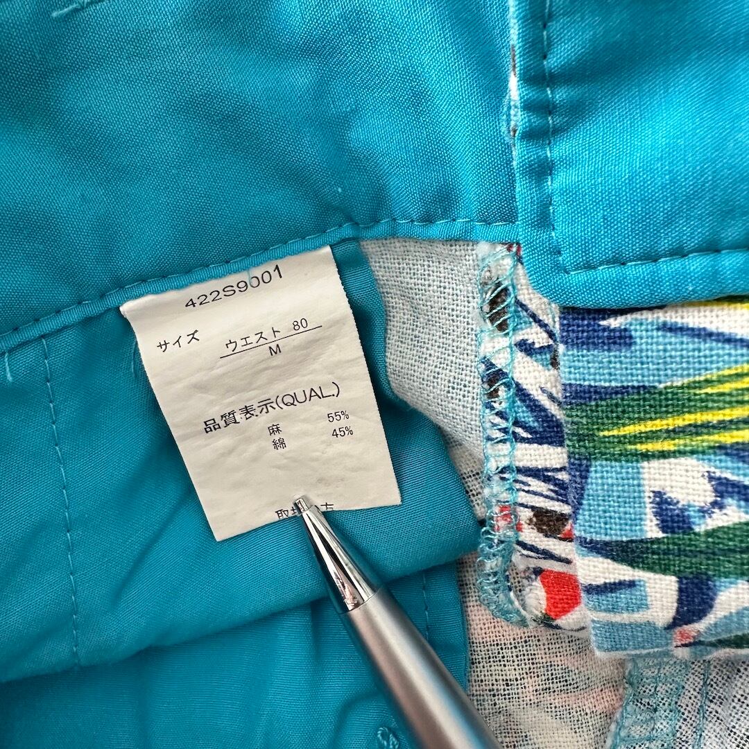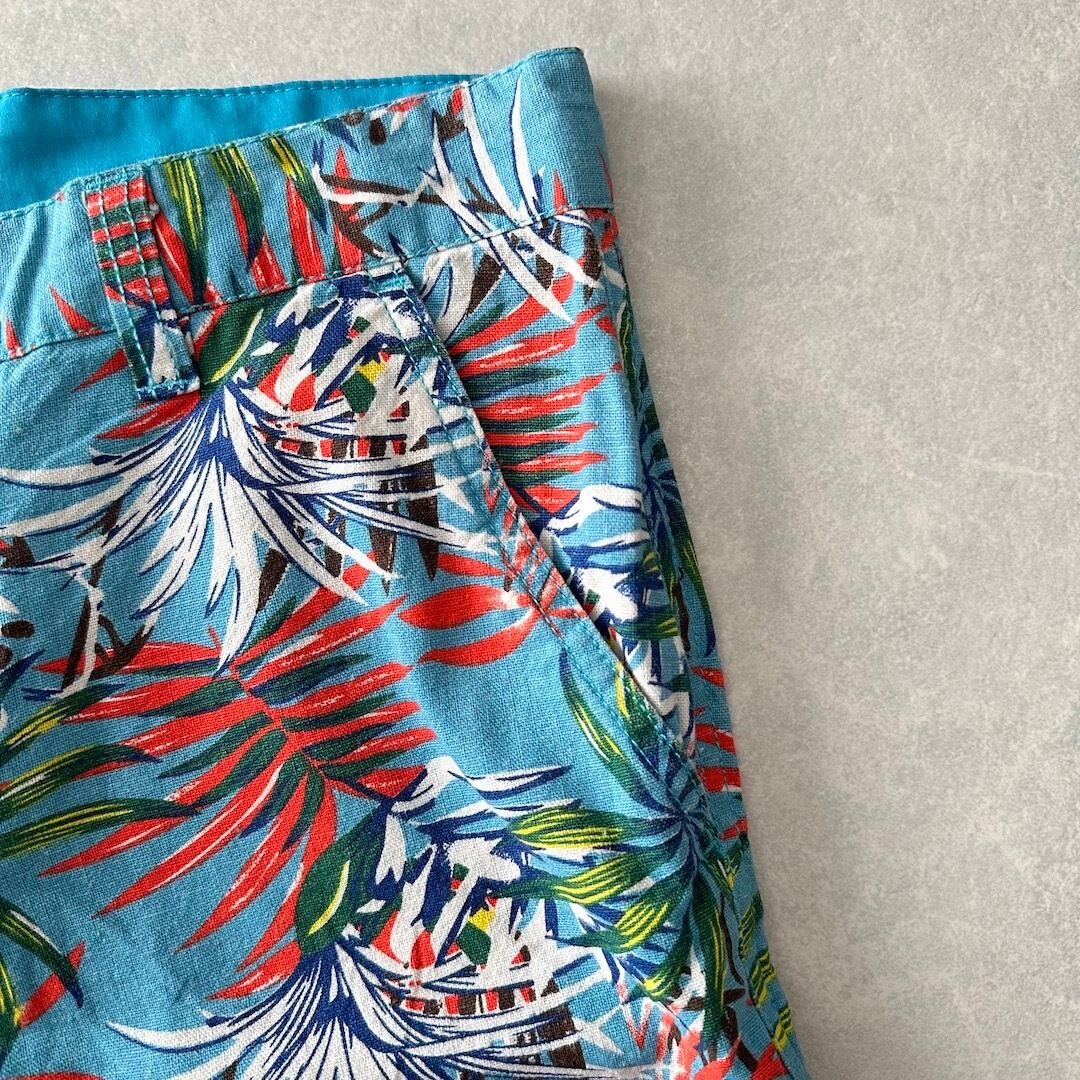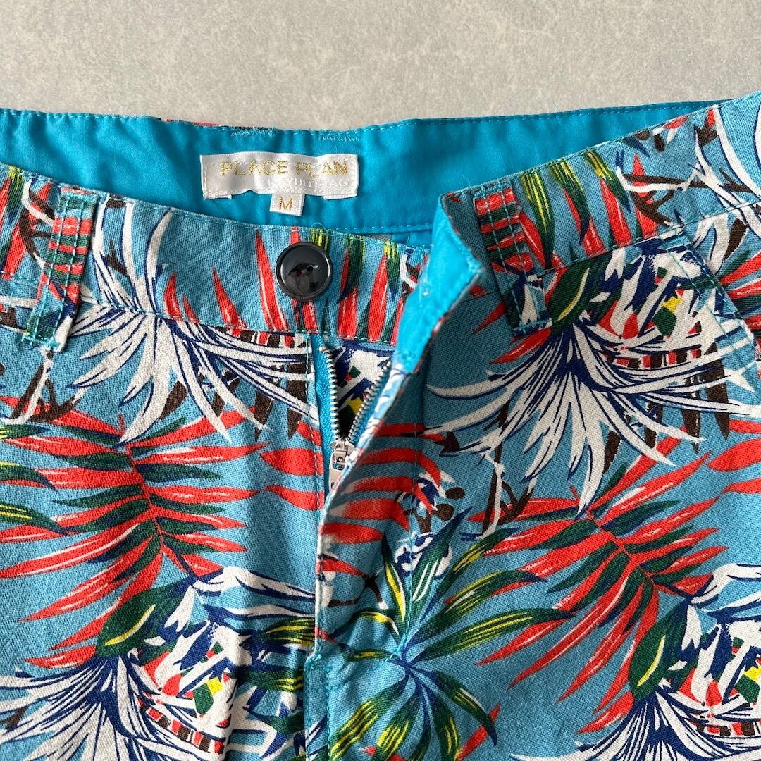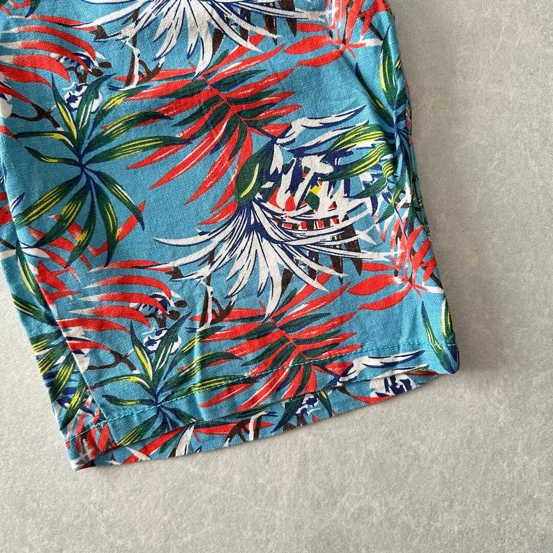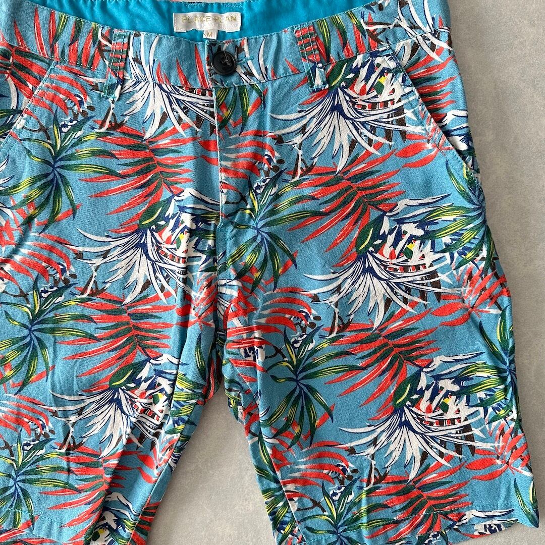 綿麻 リーフ柄 トロピカル ショートパンツ 総柄 M 古着 メンズ 古着男子 サーフ古着 サーフパンツ 海パンツ ビーチ コットン リネン 水色 オレンジ 南国