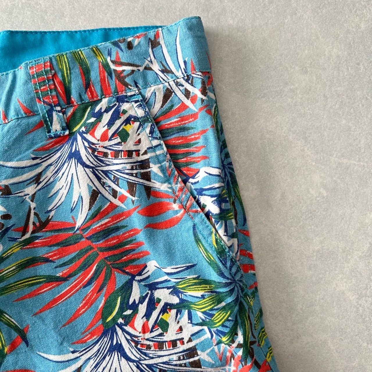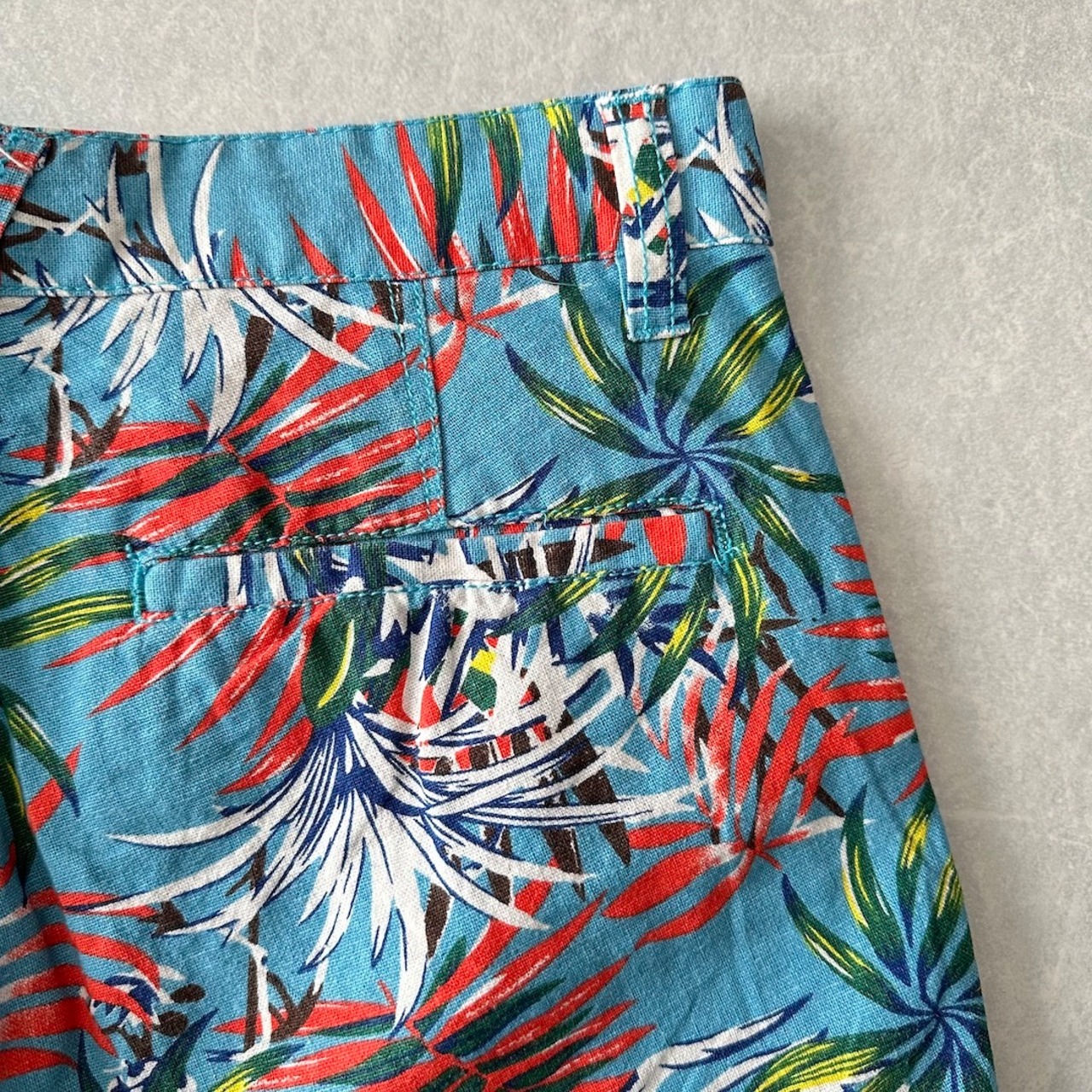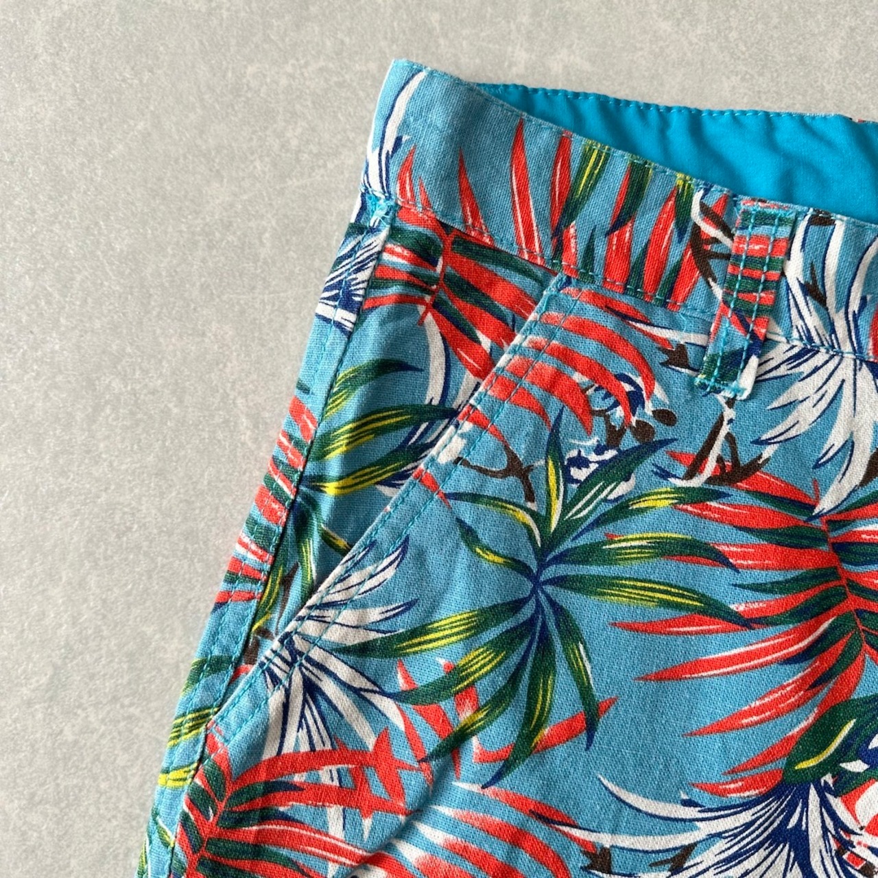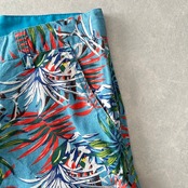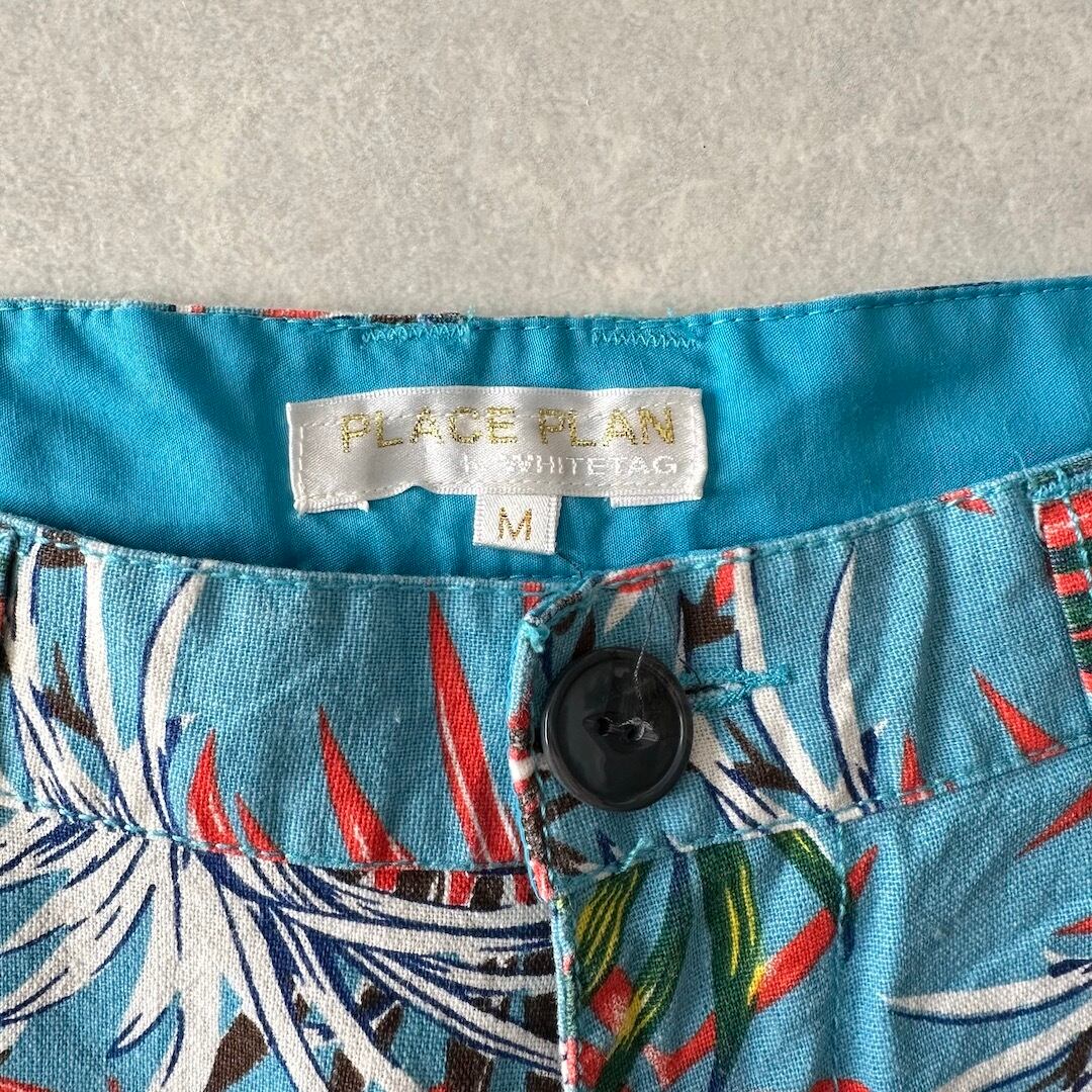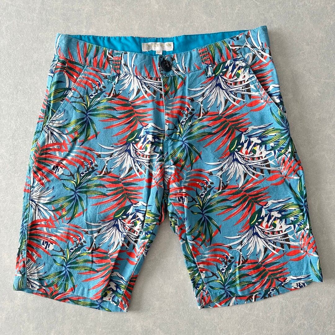 綿麻 リーフ柄 トロピカル ショートパンツ 総柄 M 古着 メンズ 古着男子 サーフ古着 サーフパンツ 海パンツ ビーチ コットン リネン 水色 オレンジ 南国