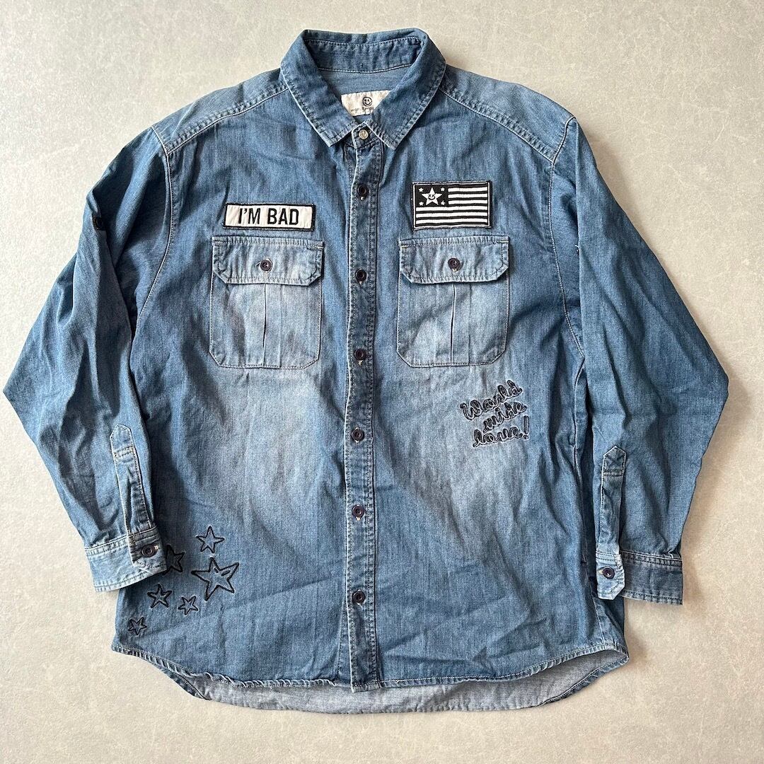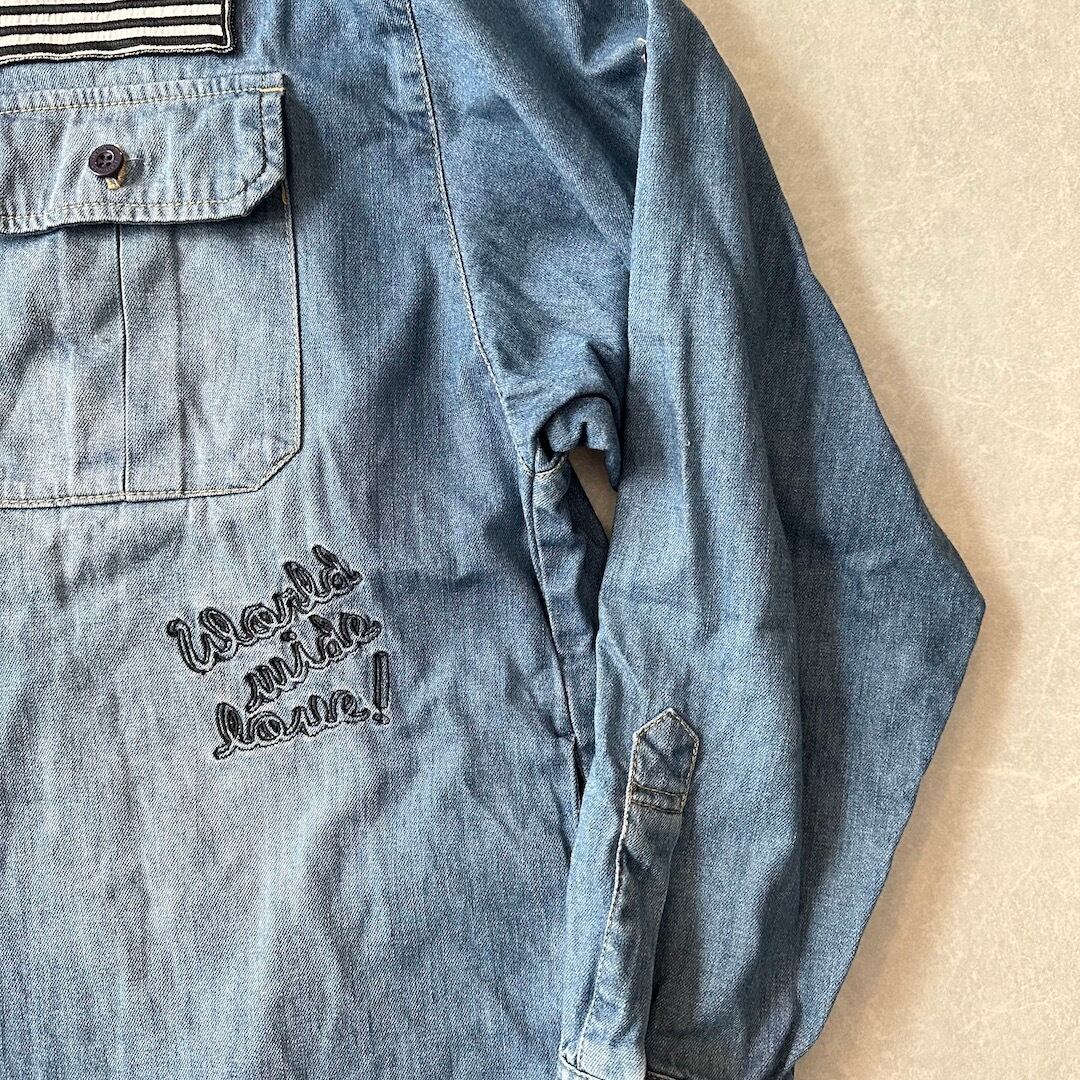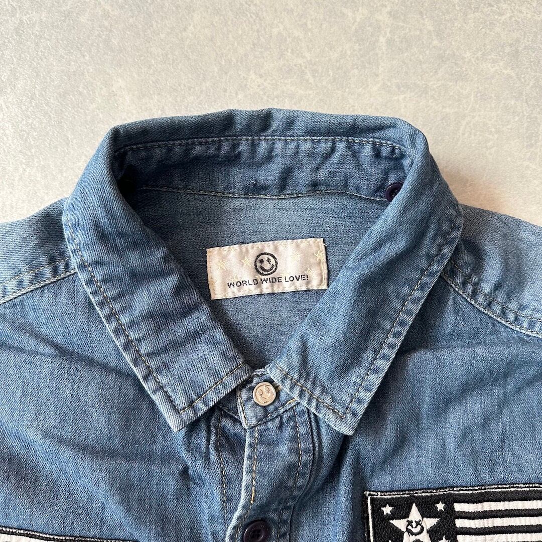【WORLD WIDE LOVE!】ワッペン 刺繍 デニム シャツ ブルー 1 古着 メンズ 古着男子 ブランド古着 アメカジ古着