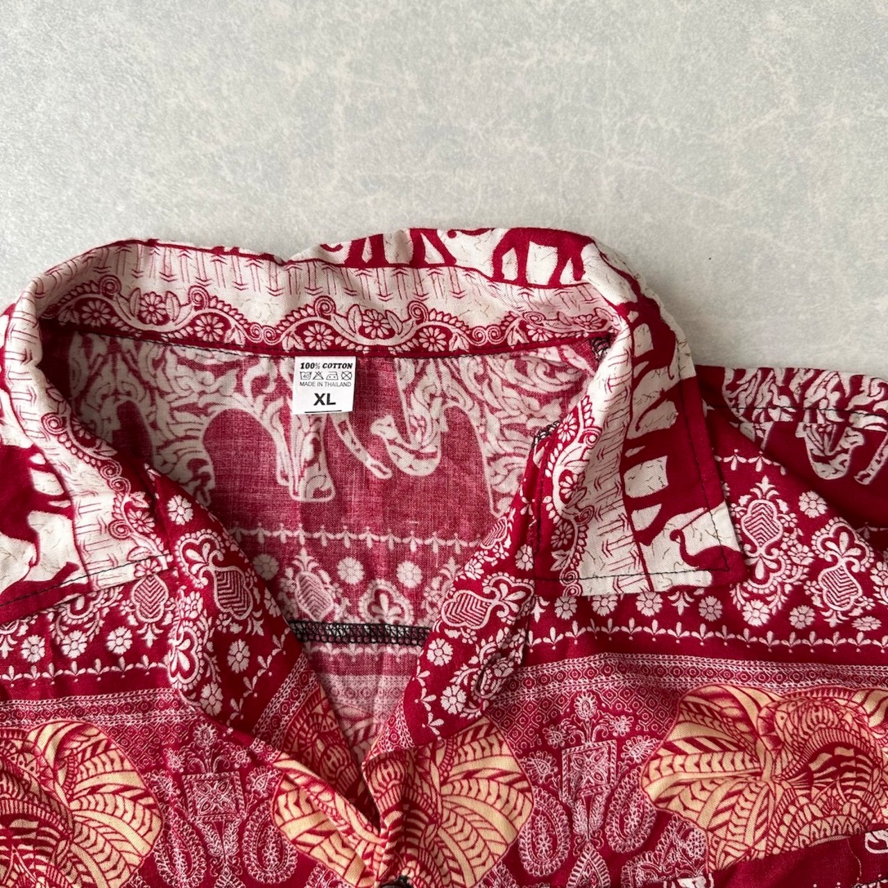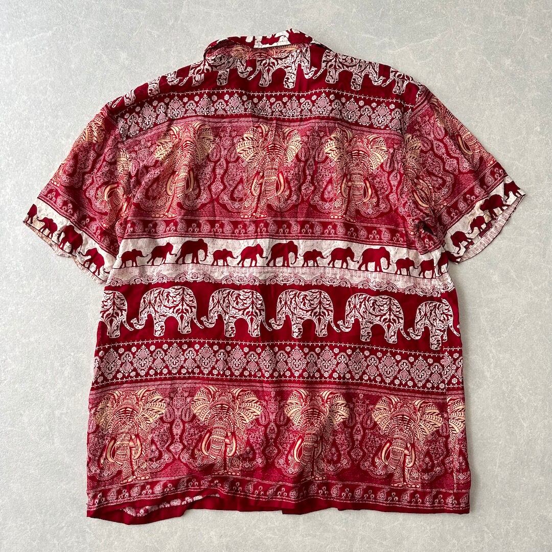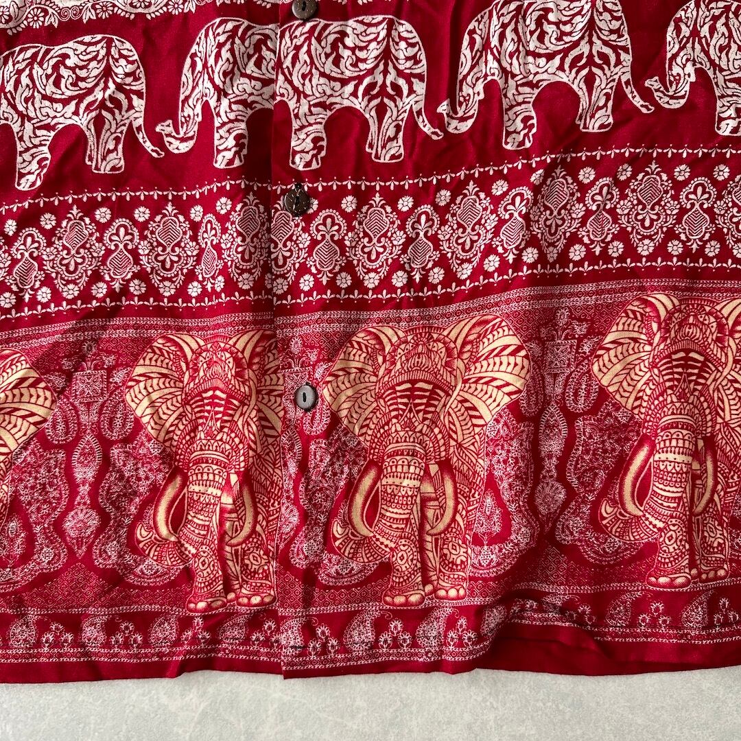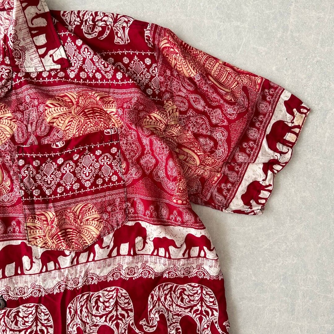 インド総柄半袖開襟シャツ レッド XL 古着 メンズ 古着男子 赤 象 ゾウ