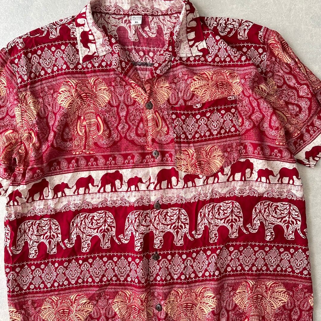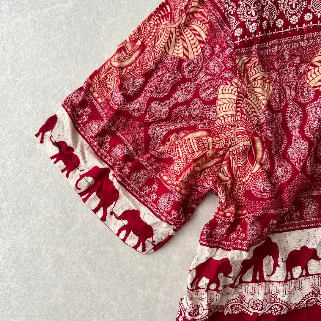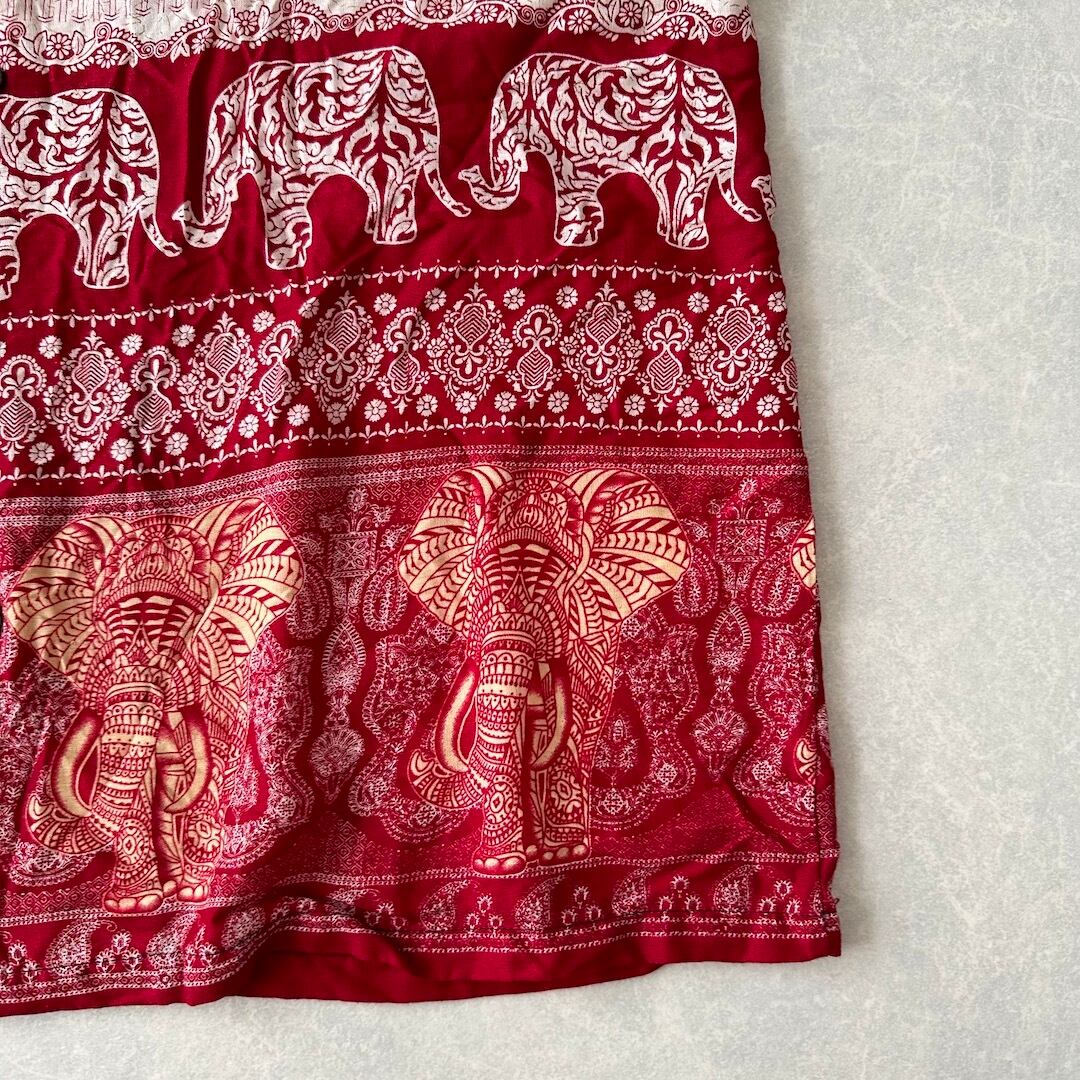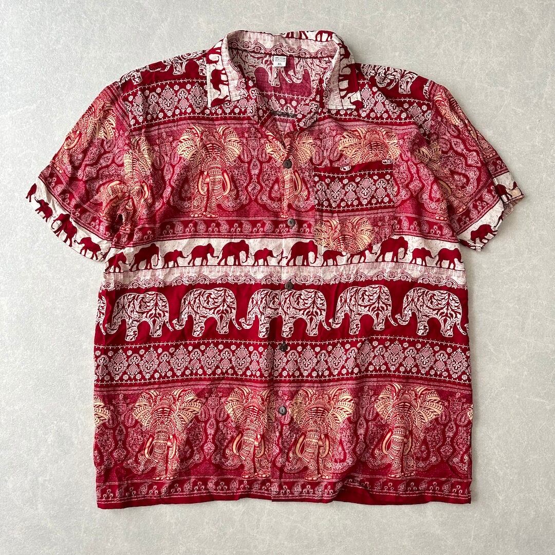 インド総柄半袖開襟シャツ レッド XL 古着 メンズ 古着男子 赤 象 ゾウ