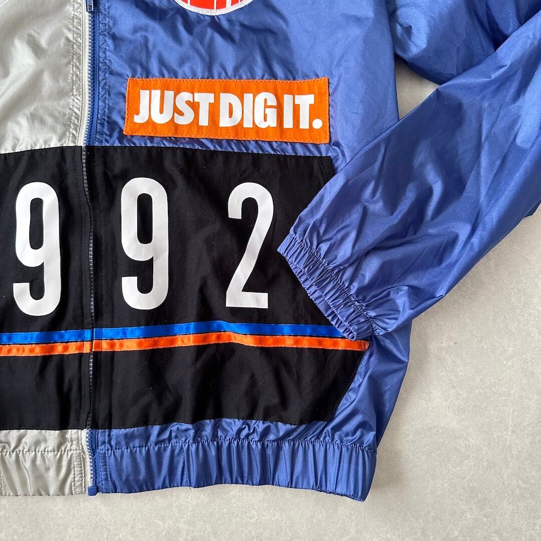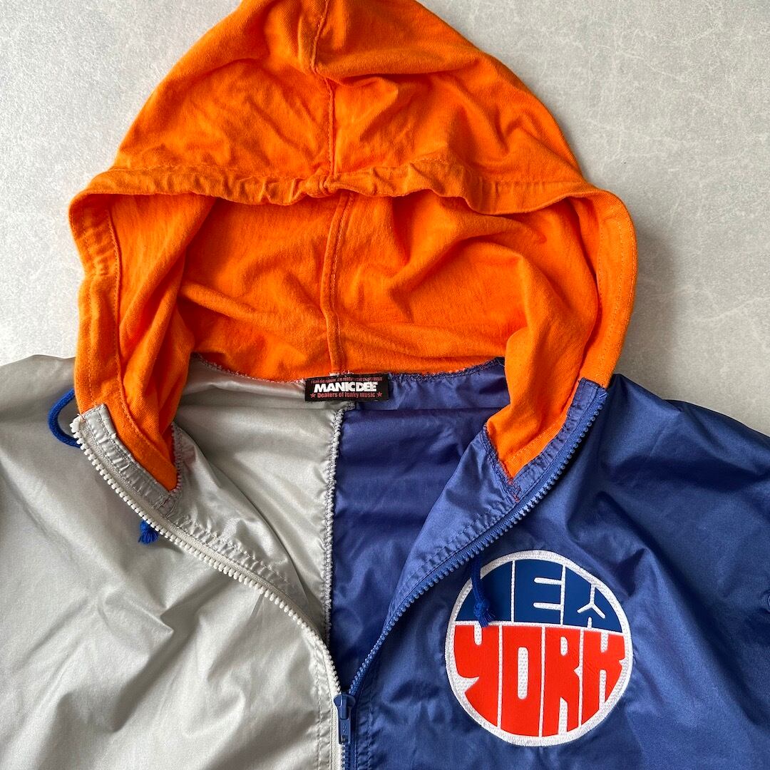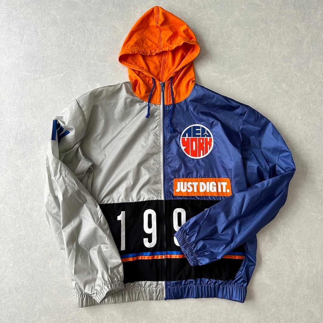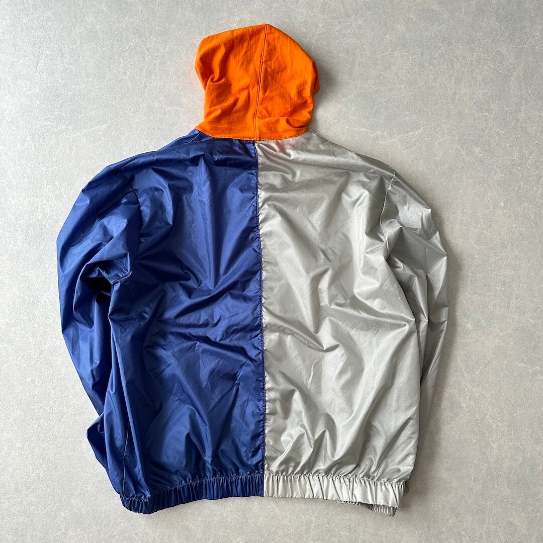 ワッペンプリントナイロンジップアップブルゾン ネイビー オレンジ グレー L 古着 メンズ 古着男子 パーカー スポーツミックス