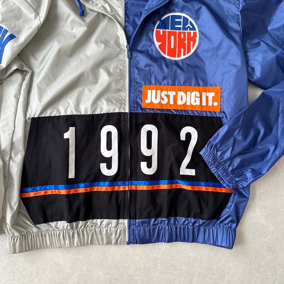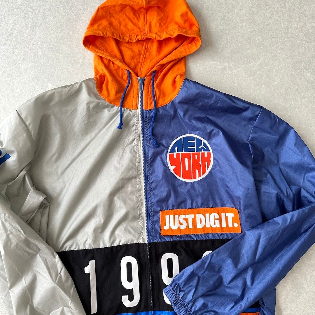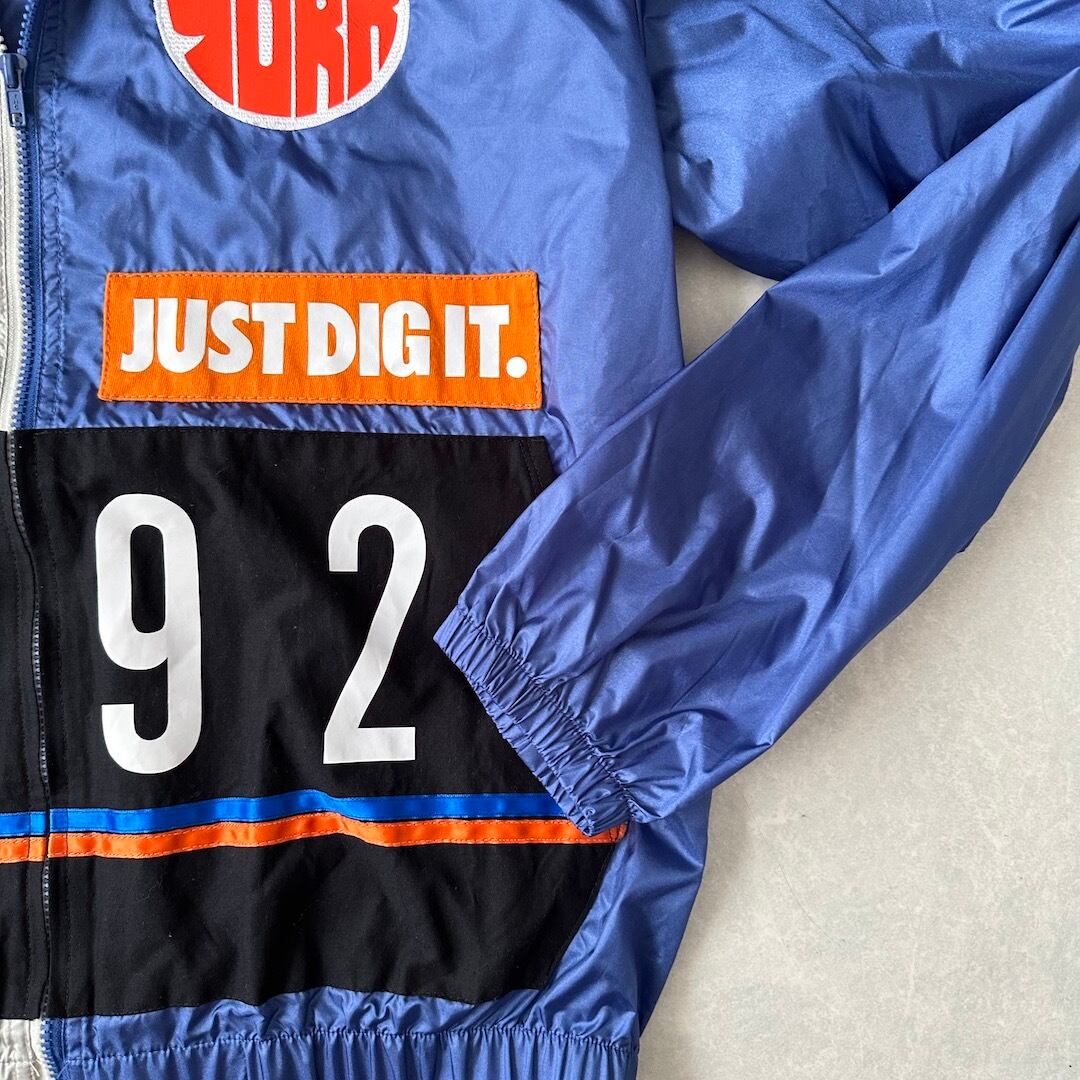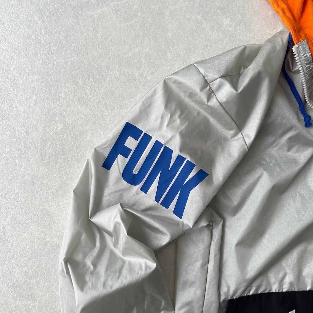 ワッペンプリントナイロンジップアップブルゾン ネイビー オレンジ グレー L 古着 メンズ 古着男子 パーカー スポーツミックス