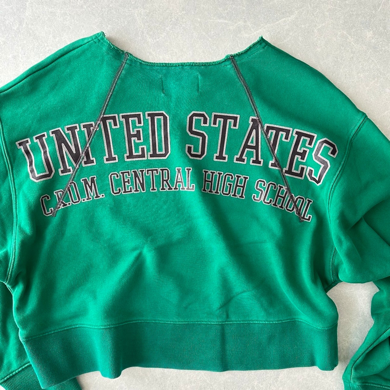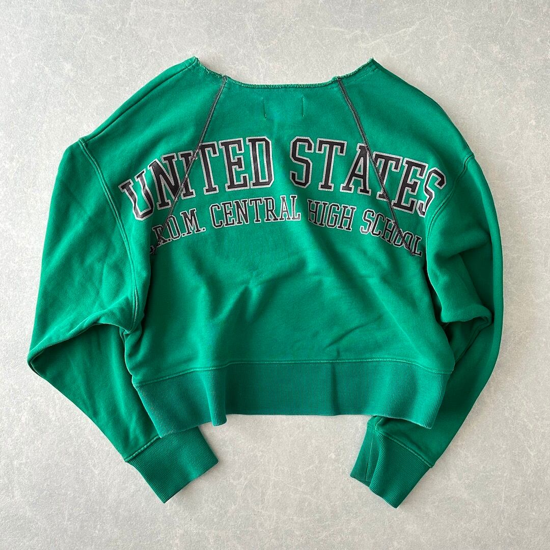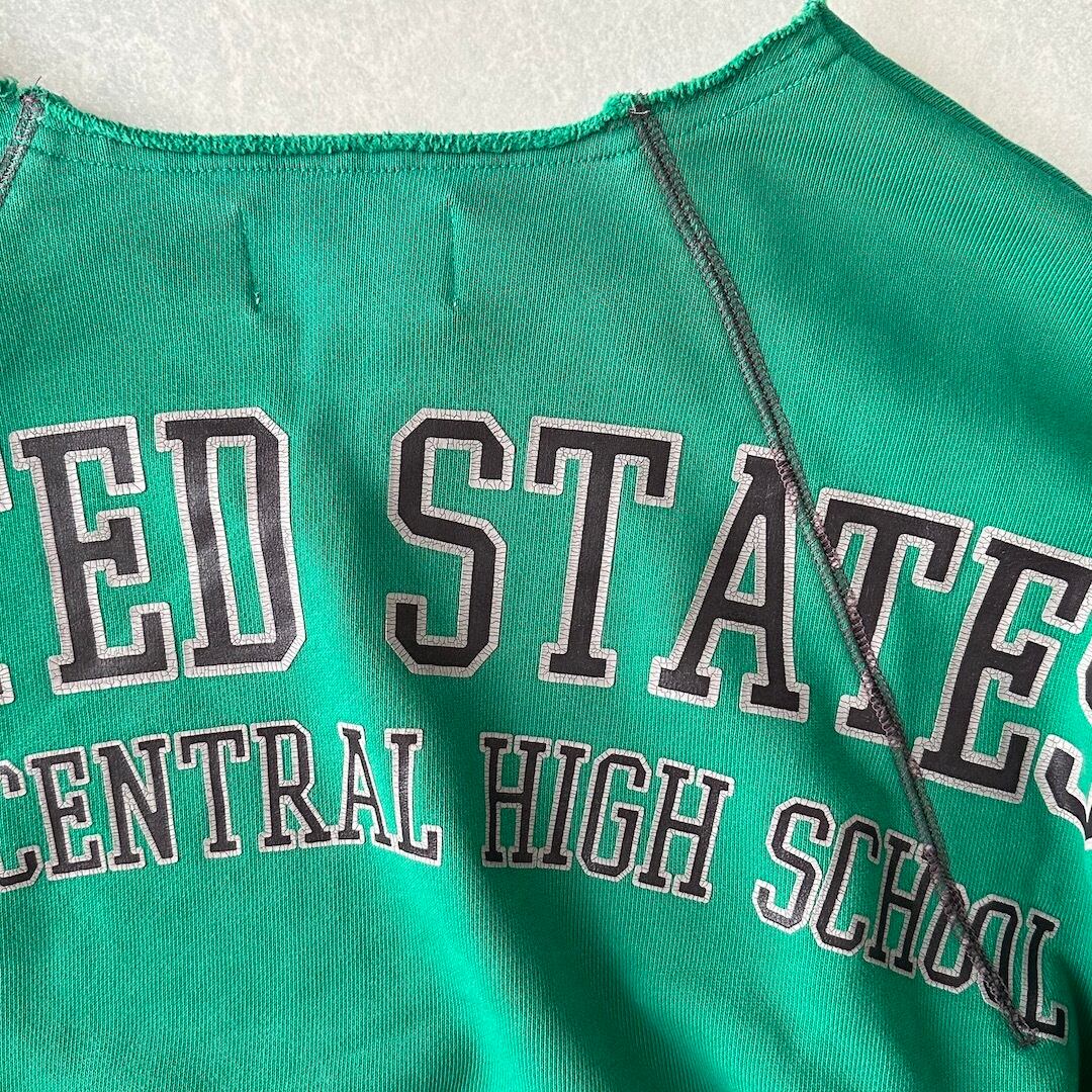 カレッジロゴプリントショート丈スウェット グリーン F 古着 レディース 古着風かすれプリント 切りっぱなし 裏毛 アメカジ