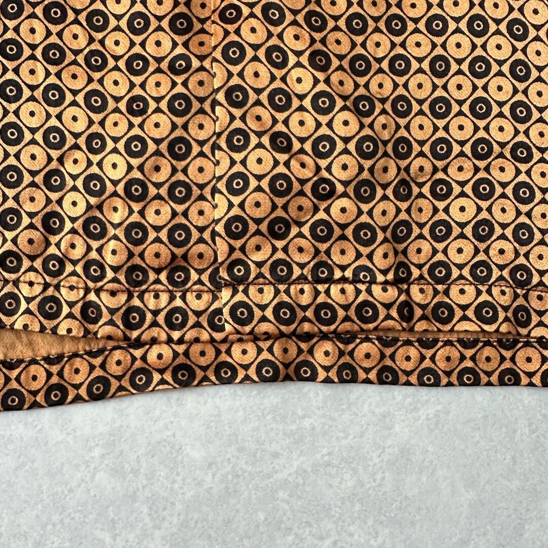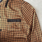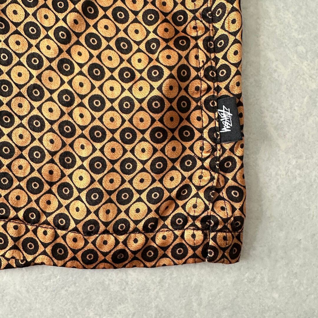 【STUSSY】モノグラム風 グラフィカル 総柄 シャツ 総柄 M 古着 メンズ 古着男子 ブランド古着 ストリート古着 ジャポニズム ゴールド 金色 パイピング