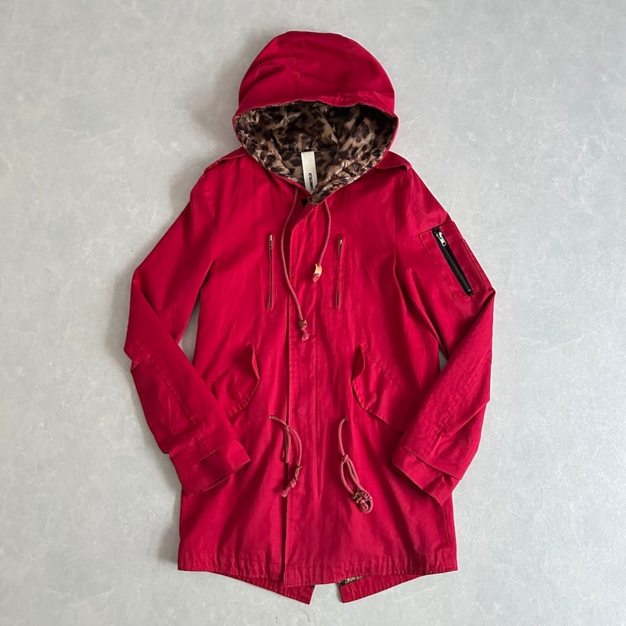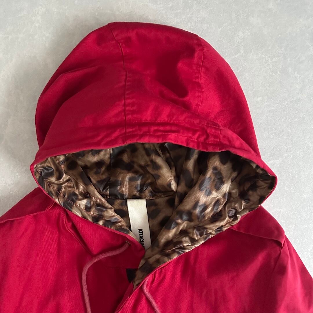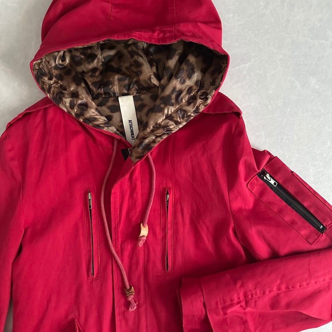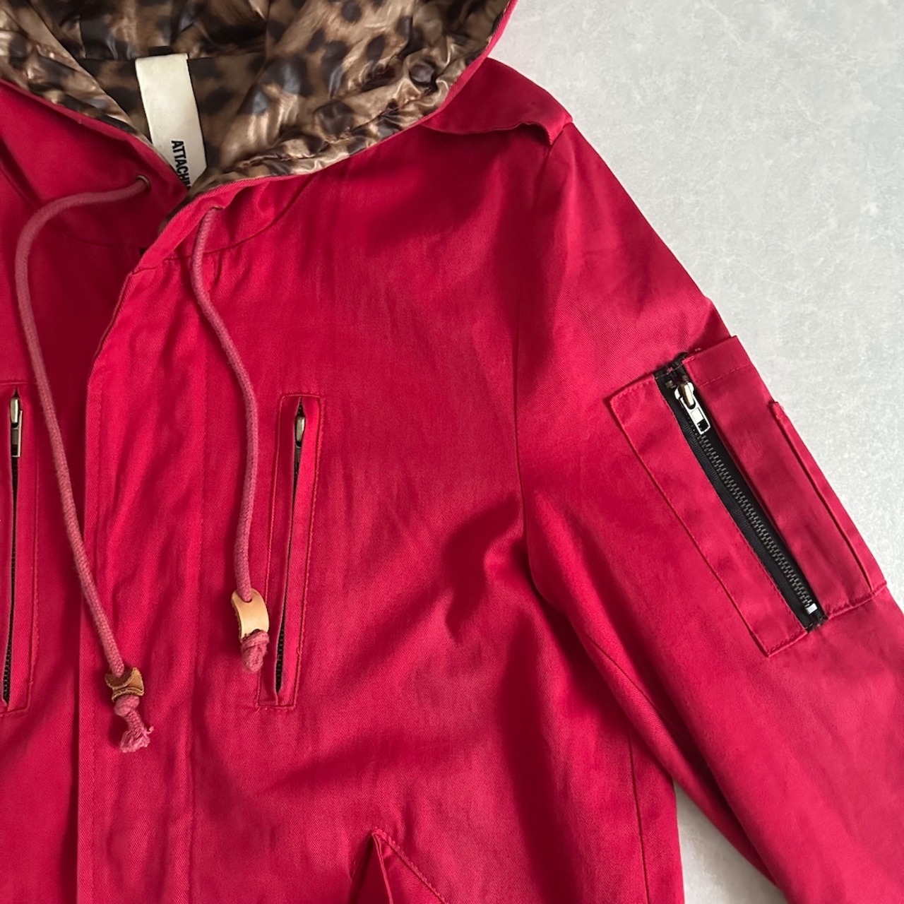 【ATTACHMENT】ヒョウ柄 裏地 M-51 ミリタリー モッズコート レッド L 古着 メンズ 古着男子 ブランド古着 軍服 パーカー フーディー ジップアップ 赤