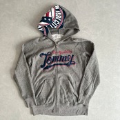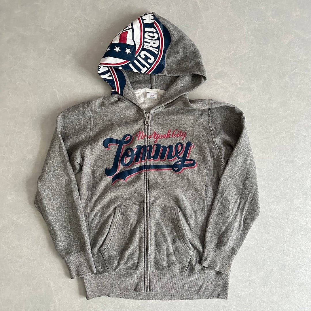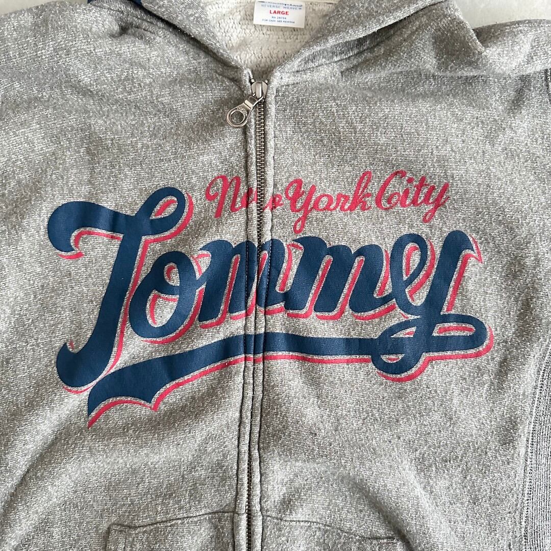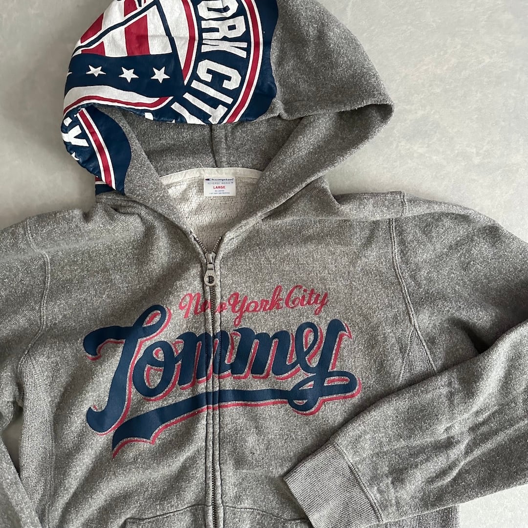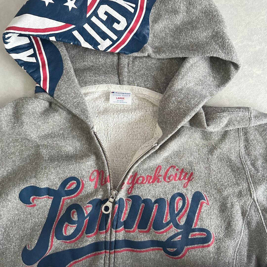 【Champion × Tommy Hilfiger】Reverse Weave Logo Print Fleece-Lined Sweat Zip Hoodie / Gray / Size L / Vintage / Men’s / Used Clothing / Brand Vintage / American Casual Vintage / Hood Print / Hoodie / Collaboration / Double Name / Cotton / Japan / Japanese vintage clothing / Furugi
