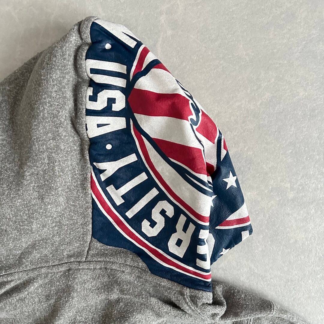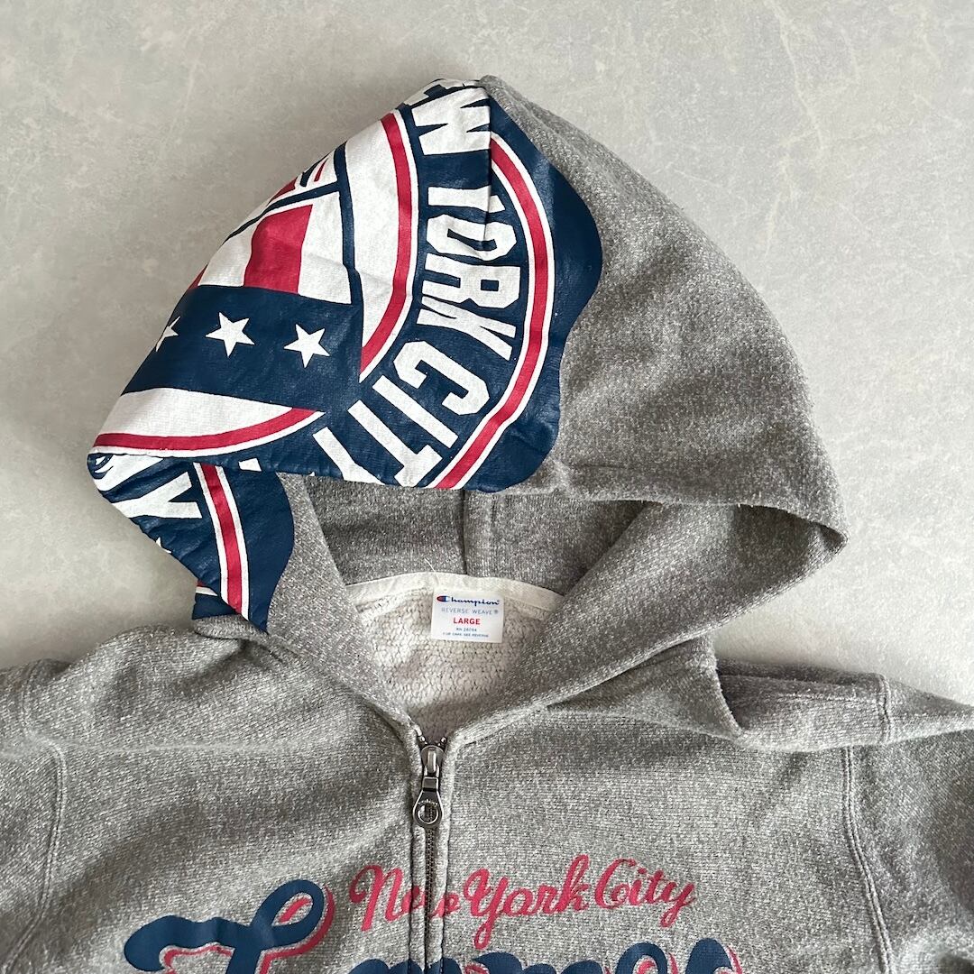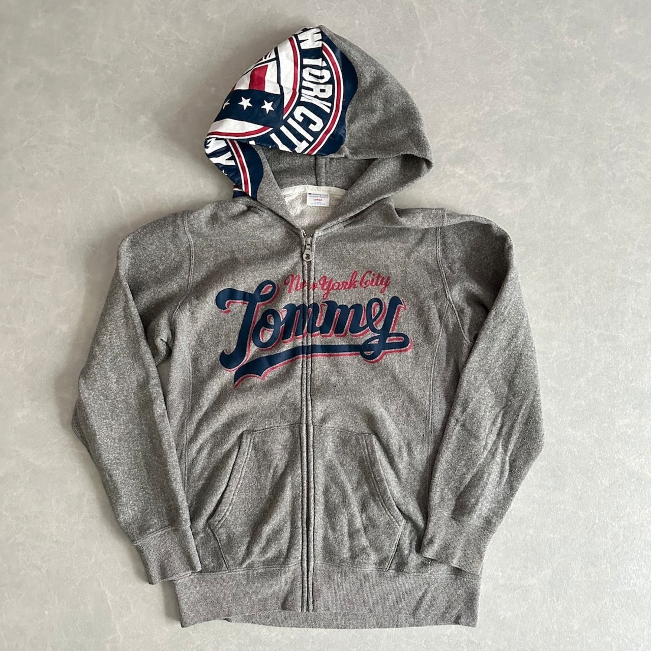 【Champion × Tommy Hilfiger】リバースウィーブ ロゴ プリント 裏毛 スウェット ジップパーカー グレー L 古着 メンズ 古着男子 ブランド古着 アメカジ古着 フードプリント フーディー コラボ コラボレーション ダブルネーム コットン 綿