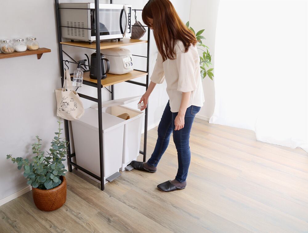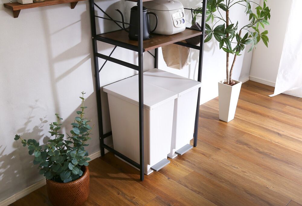 一般的な容量45Lスリムタイプの蓋付きゴミ箱が2個並べられ分別に便利です!