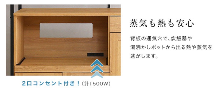 出し入れしやすいスライドトレーには2口コンセントがついており炊飯器など置くのにピッタリです。