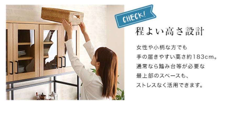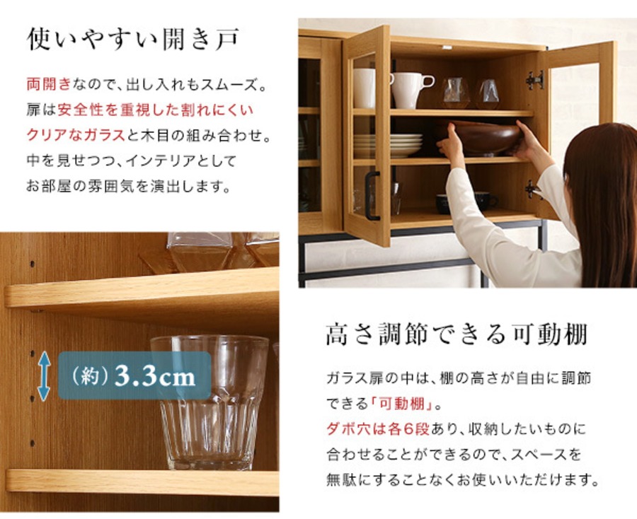 上段はガラス扉の収納なのでオシャレに魅せる収納ができます。