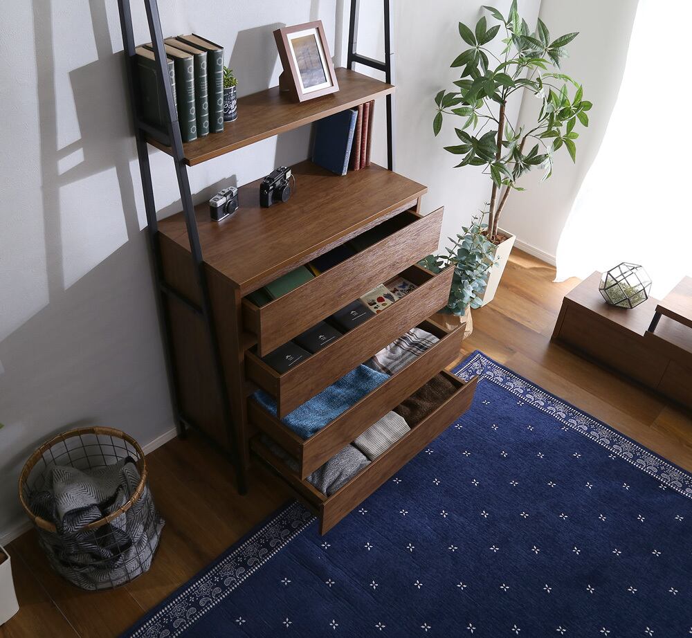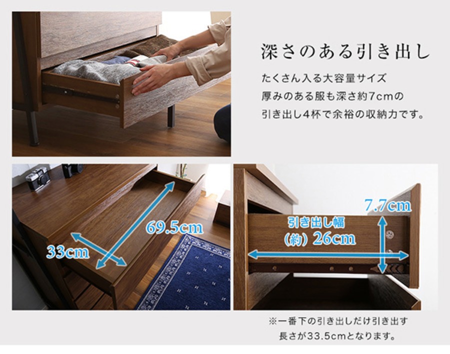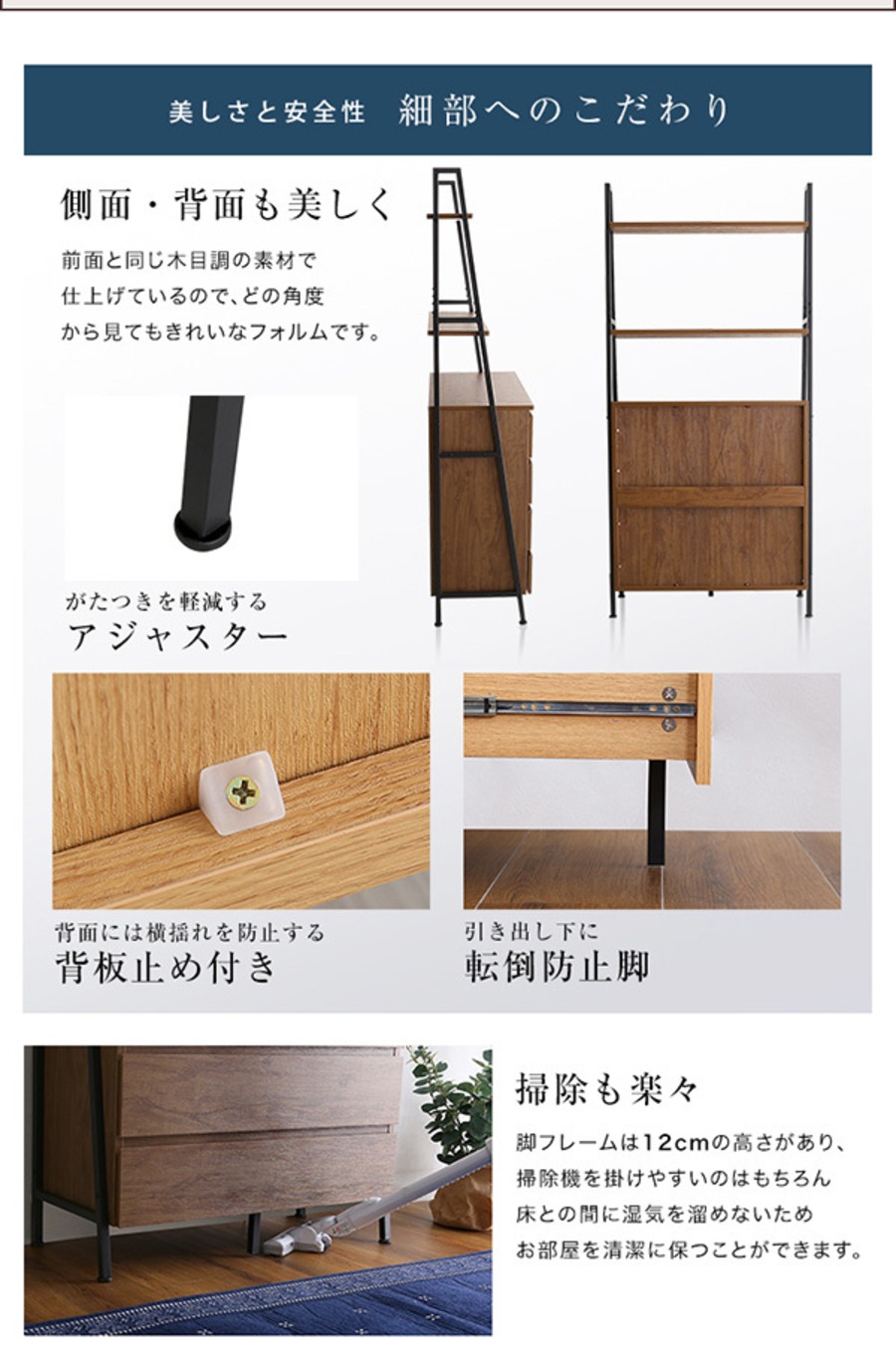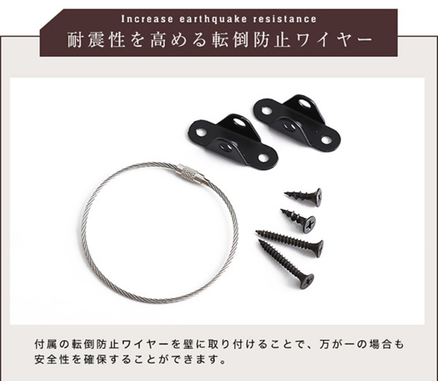 事故が起きないように、転倒防止ワイヤーに加え、引き出し下に転倒防止脚を取り付けることで、家族の安全を守ります。