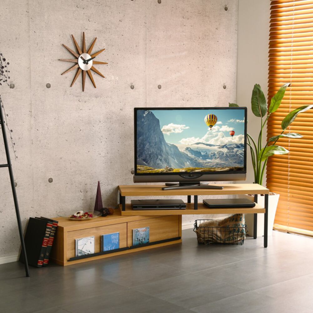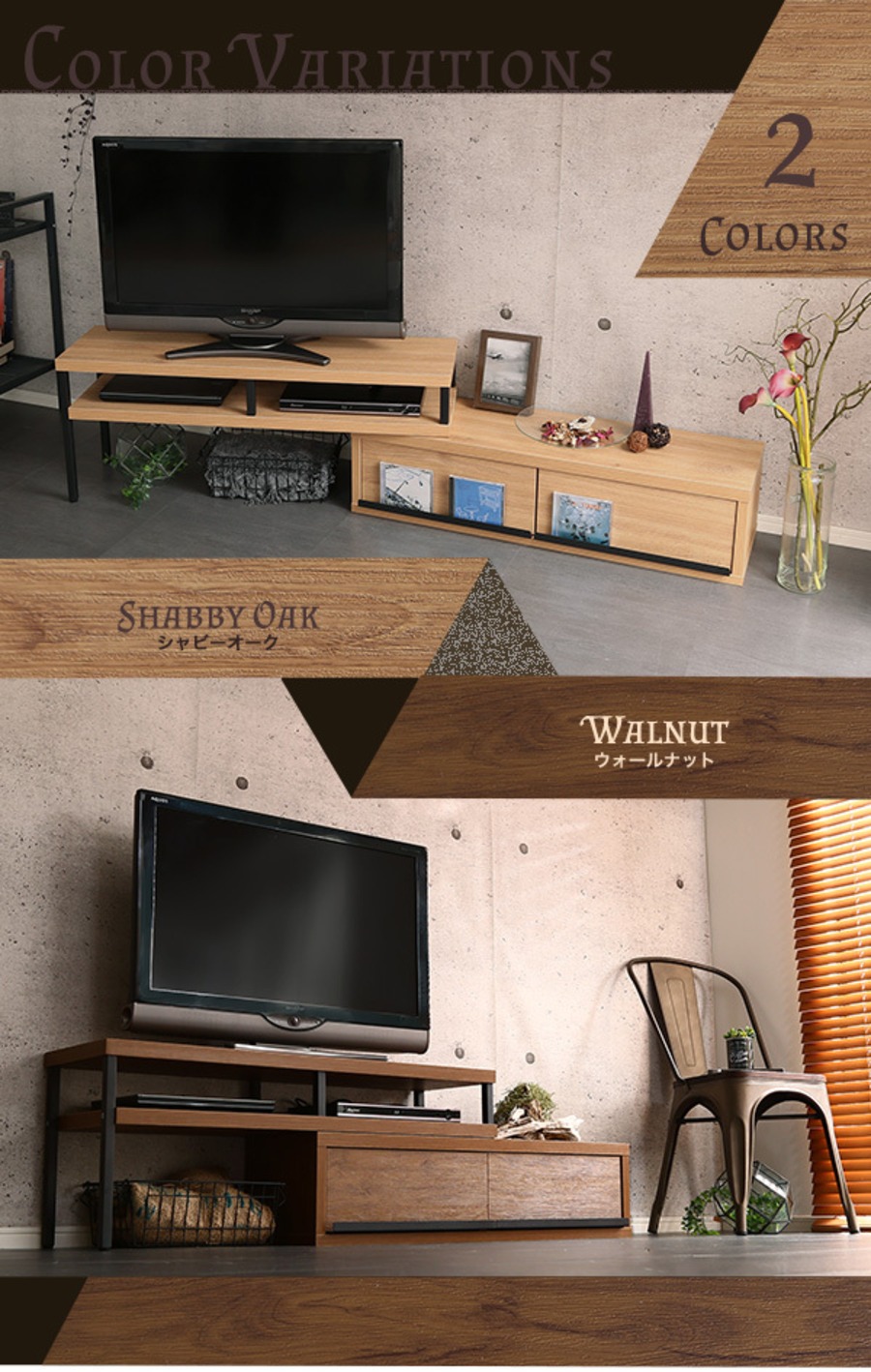 スチール脚のヴィンテージ伸縮テレビ台!これひとつでお部屋をスタイリッシュに!上段と下段の組み合わせで伸縮ができるので、お部屋やテレビのサイズに合わせ、コンパクトにもワイドにも自由なレイアウトが楽しめます。完成品なので、届いたその日にセッティングOK!オシャレなシャビーオークとウォールナットの2色展開!