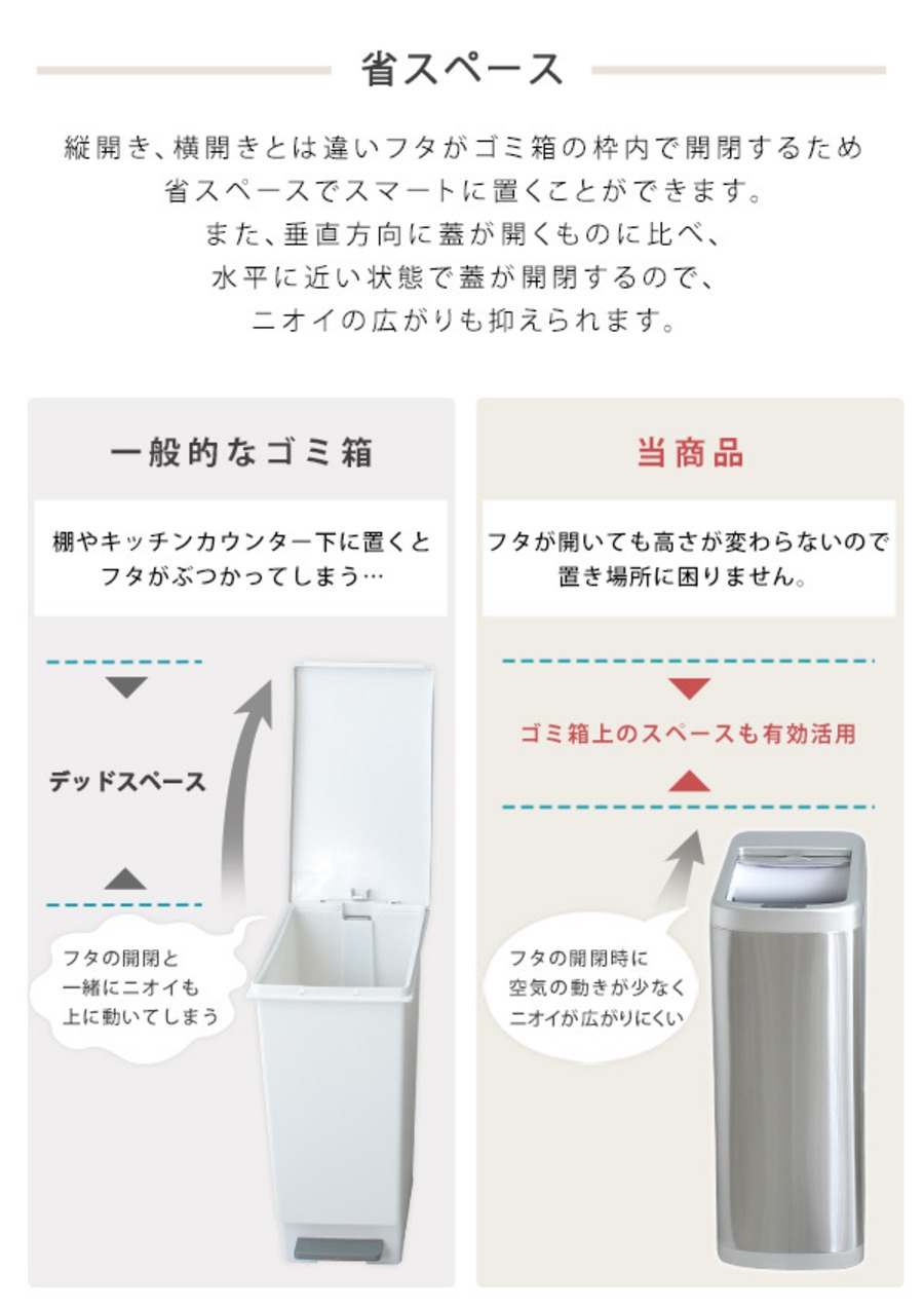 縦開き、横開きとは違い蓋がゴミ箱の枠内で開閉するため省スペースでスマートに置くことができます。