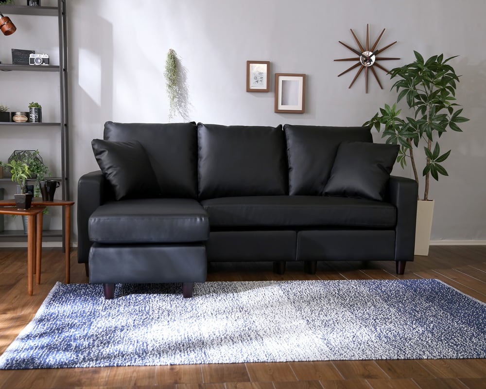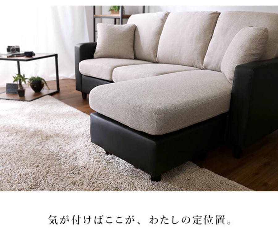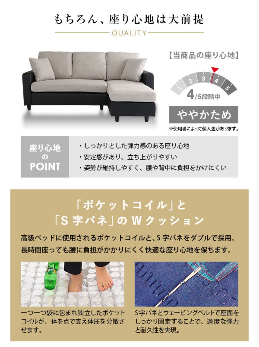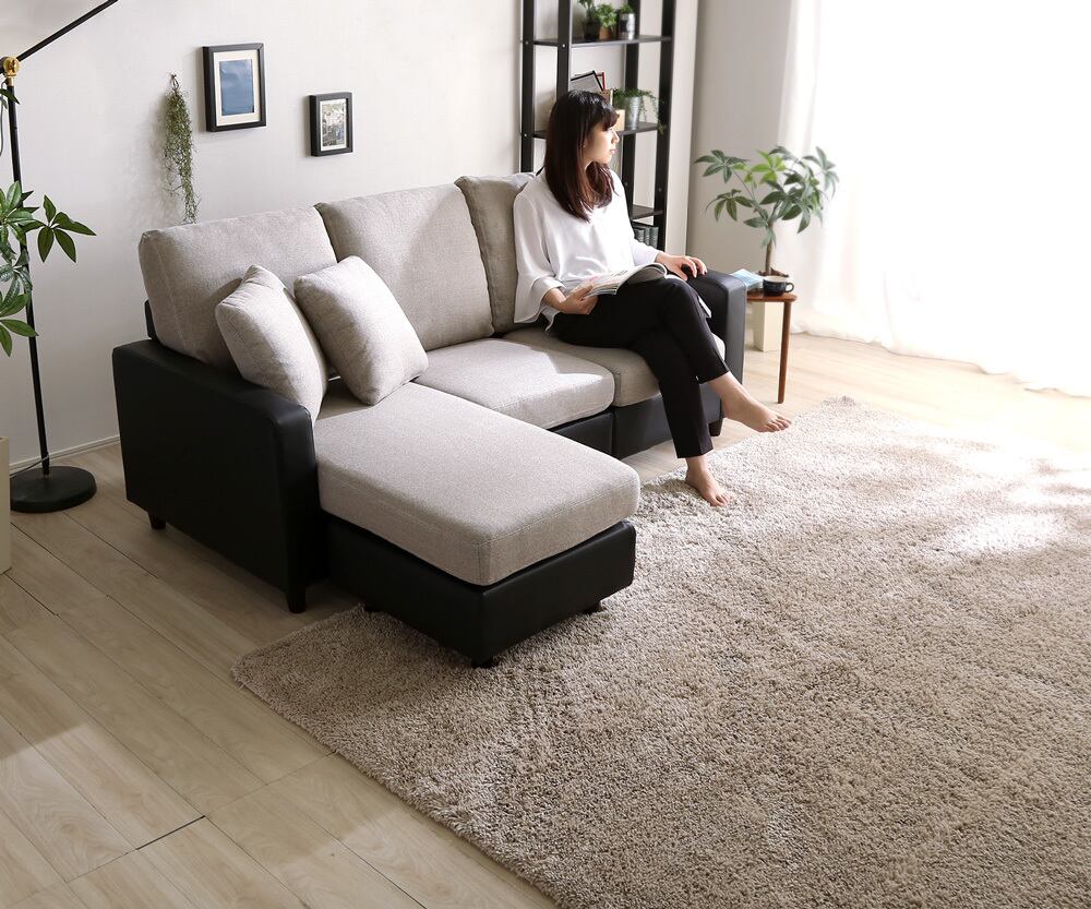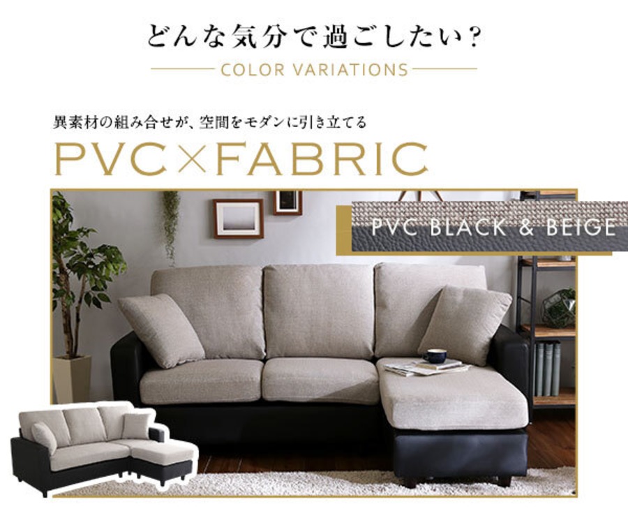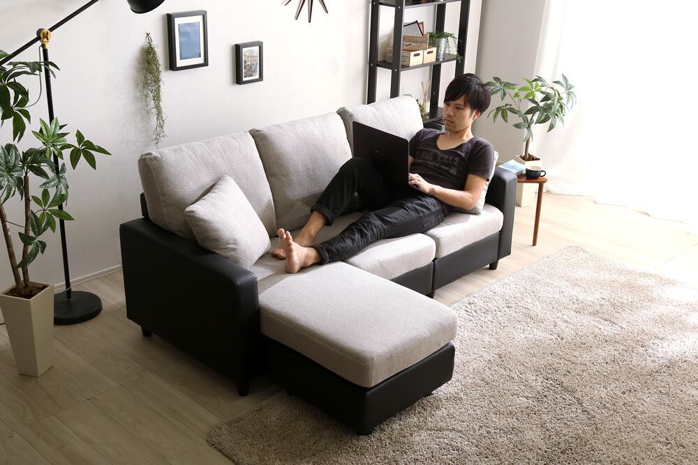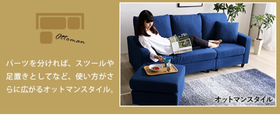 カウチにもオットマンにも、気軽にスタイルチェンジできる3人掛けソファ。 ポケットコイルとS字バネのWクッション採用で、しっかりとした弾力感のある座り心地。 PVCやファブリックなど豊富な8色展開。組み立ても簡単!