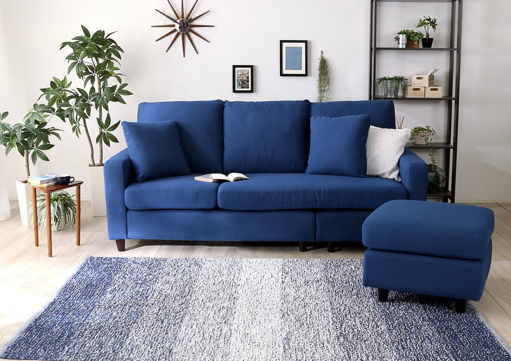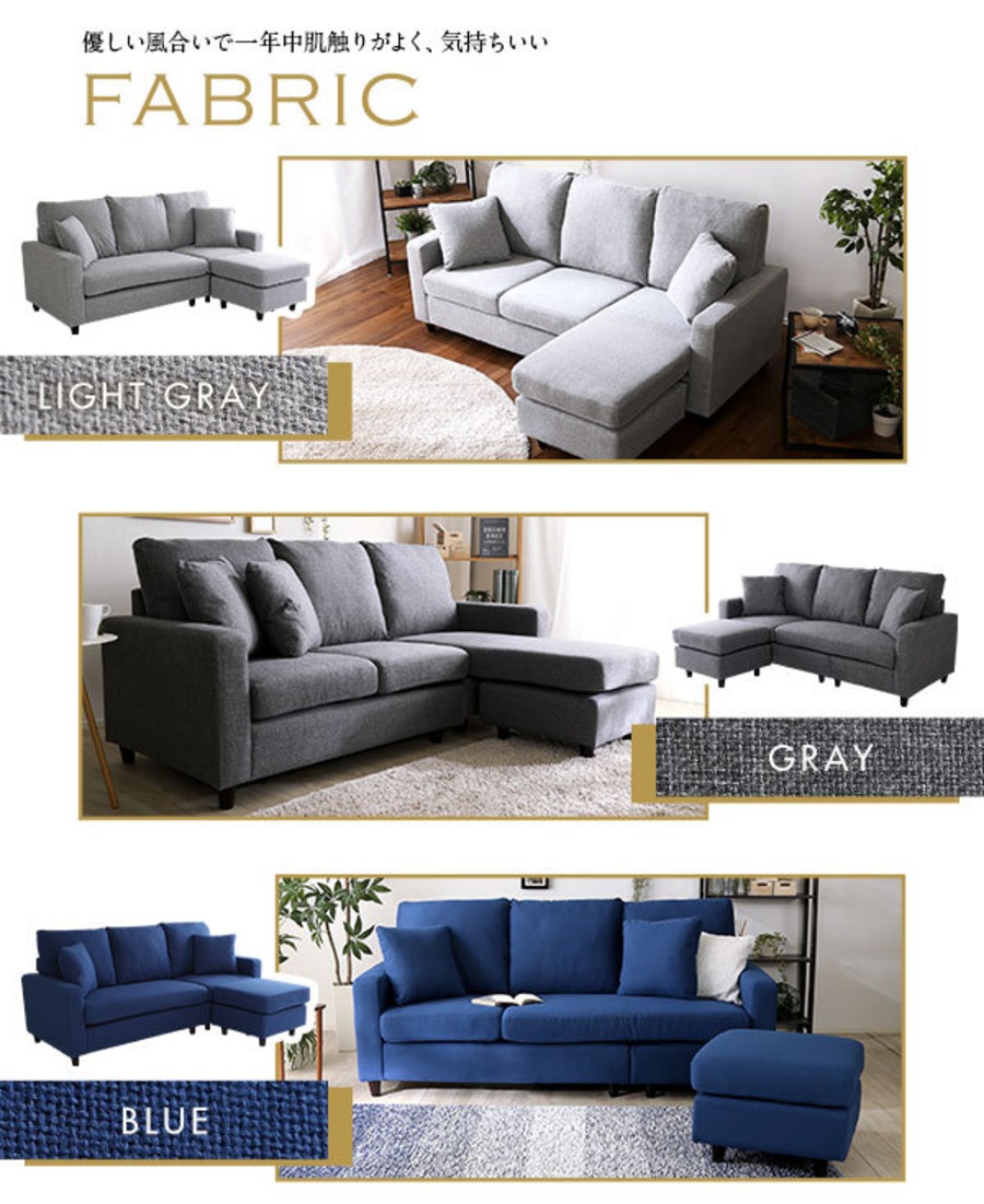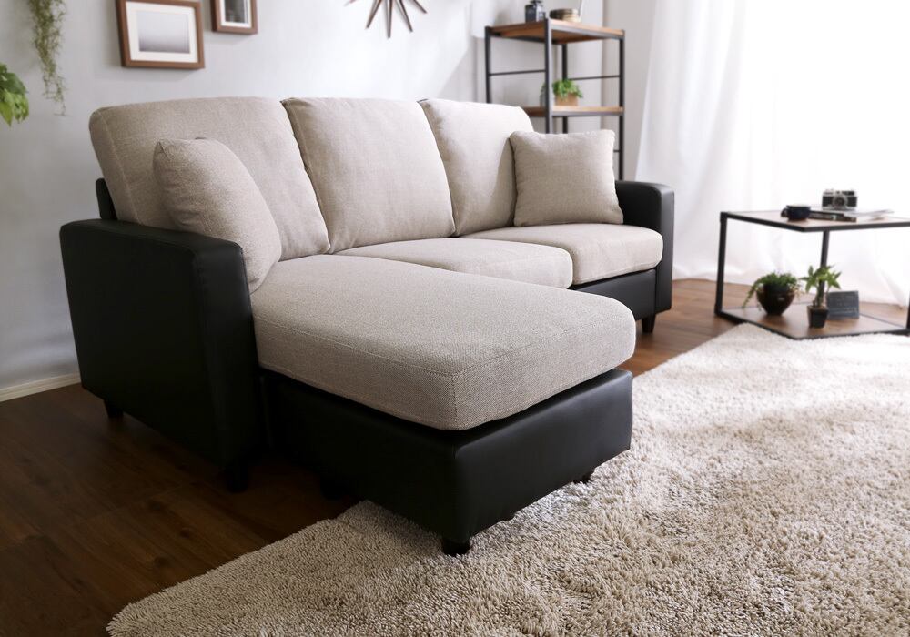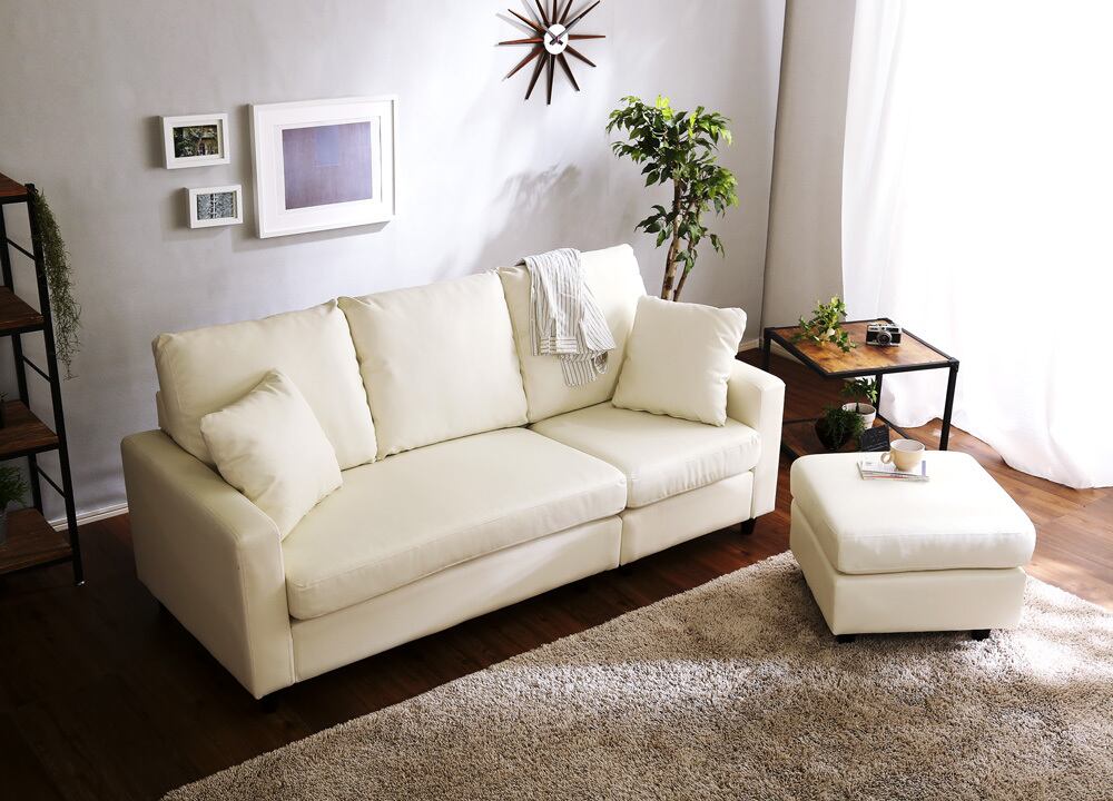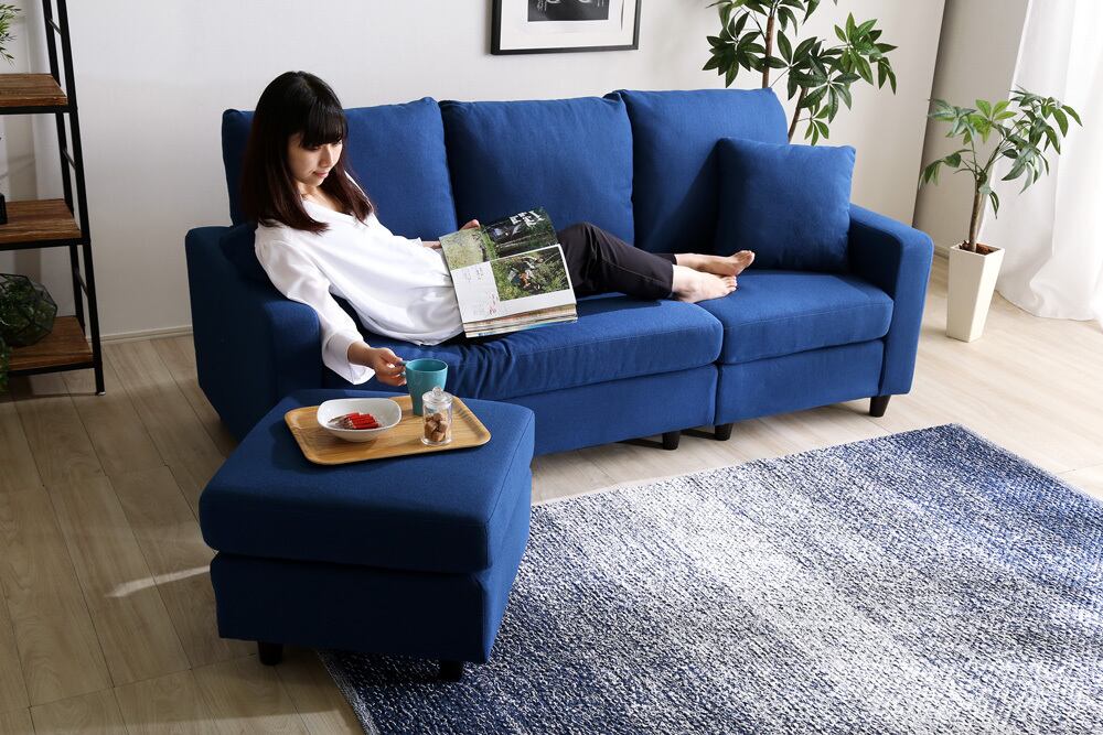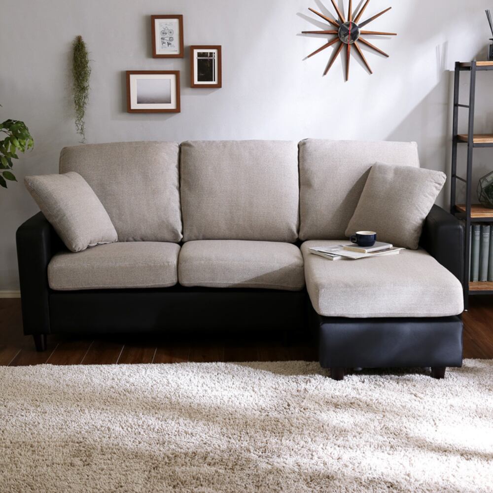 カウチにもオットマンにも、気軽にスタイルチェンジできる3人掛けソファ。 ポケットコイルとS字バネのWクッション採用で、しっかりとした弾力感のある座り心地。 PVCやファブリックなど豊富な8色展開。組み立ても簡単!