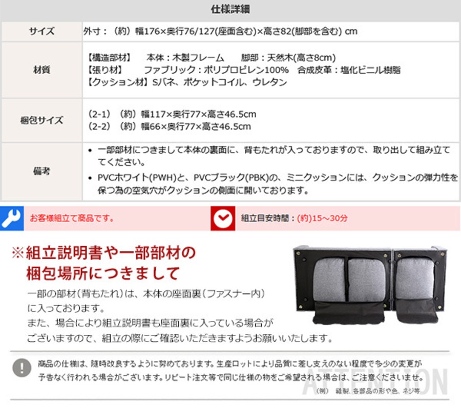 【張り材】ファブリック:ポリエステル 100% 合成皮革:塩化ビニル樹脂